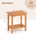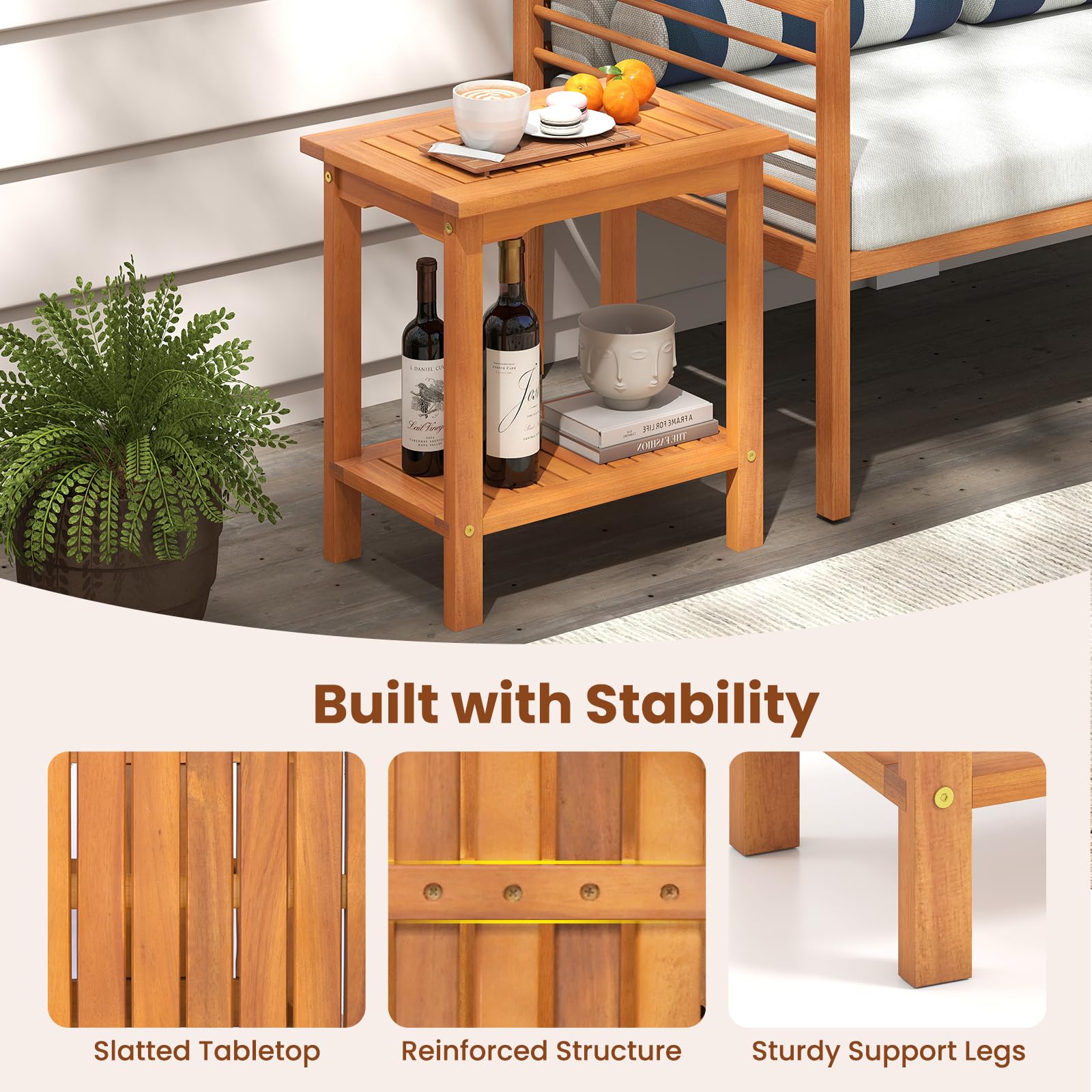 Crafted from premium acacia wood, this outdoor end table boasts durability and natural beauty. The wide tabletop provides ample space for displaying decorative items or holding drinks and snacks, while the bottom shelf offers additional storage options. Moreover, the compact design makes it ideal for use as a stylish accent piece or a functional outdoor furniture. Whether placed in your living room, patio, or garden, this acacia wood side table combines functionality and aesthetics for a timeless appeal.