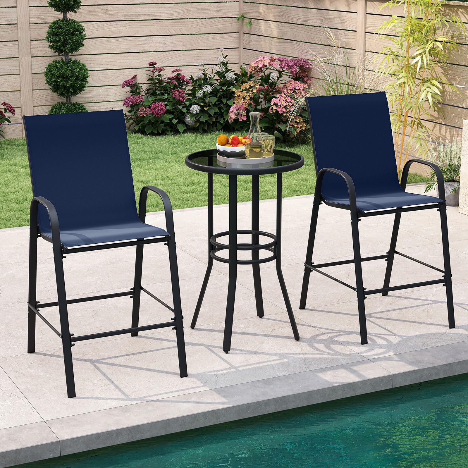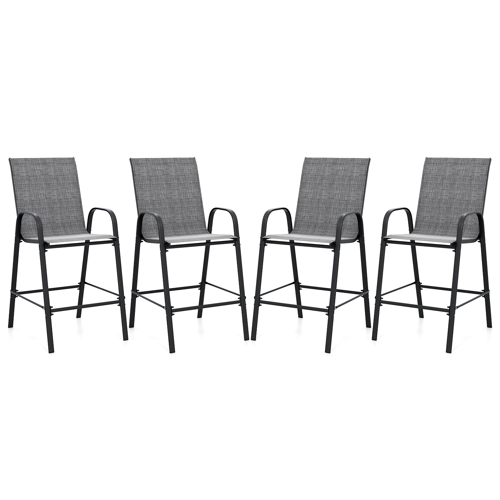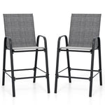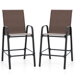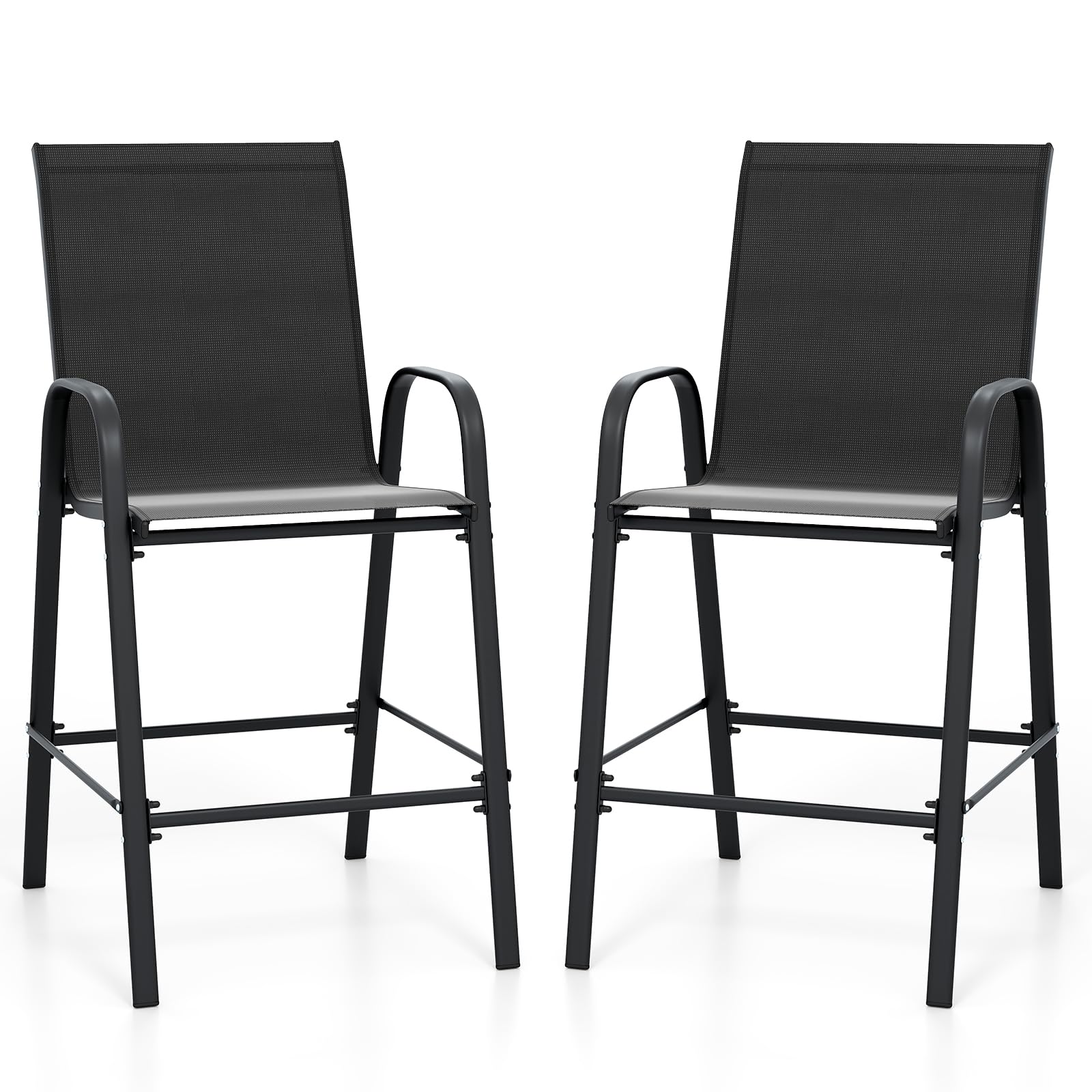 Enjoy a comfortable and relaxing outdoor time with the 29" bar stool set, featuring premium fabric that is breathable, tear-proof, and sun-protective. With ergonomic features like a high backrest, curved armrests, and a 11.5" high footrest, these outdoor barstools offer optimal support. The spacious seat, measuring 21" by 16", ensures ample room for relaxation. Constructed with a sturdy metal frame that supports up to 330 lbs, these bar chairs come with protective foot pads for added stability. Perfect for various outdoor settings, such as decks, poolside, and front porches, these stylish stools are designed to complement bar tables between 40" and 43" in height.