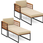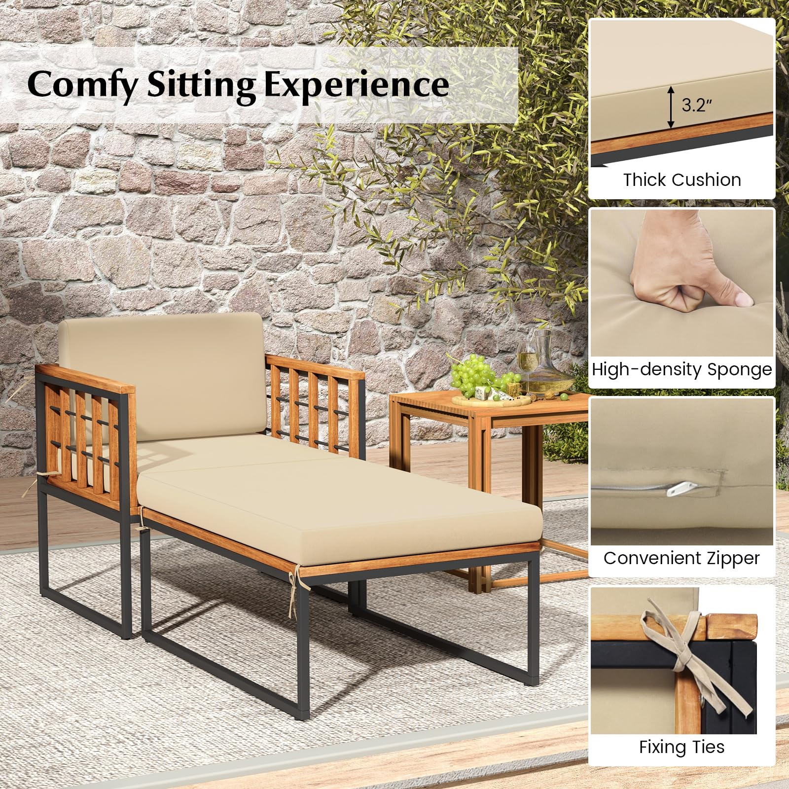 Vary from others, our pool lounge chair includes an armchair and an ottoman, which allows you to tailor the arrangement to your specific needs. Both armchair and ottoman are designed with soft and thick cushions, providing you with a comfy sitting or lying experience. Moreover, the solid acacia wood and heavy-duty metal frame endow this patio furniture set with strong stability for robust support.