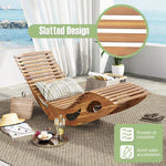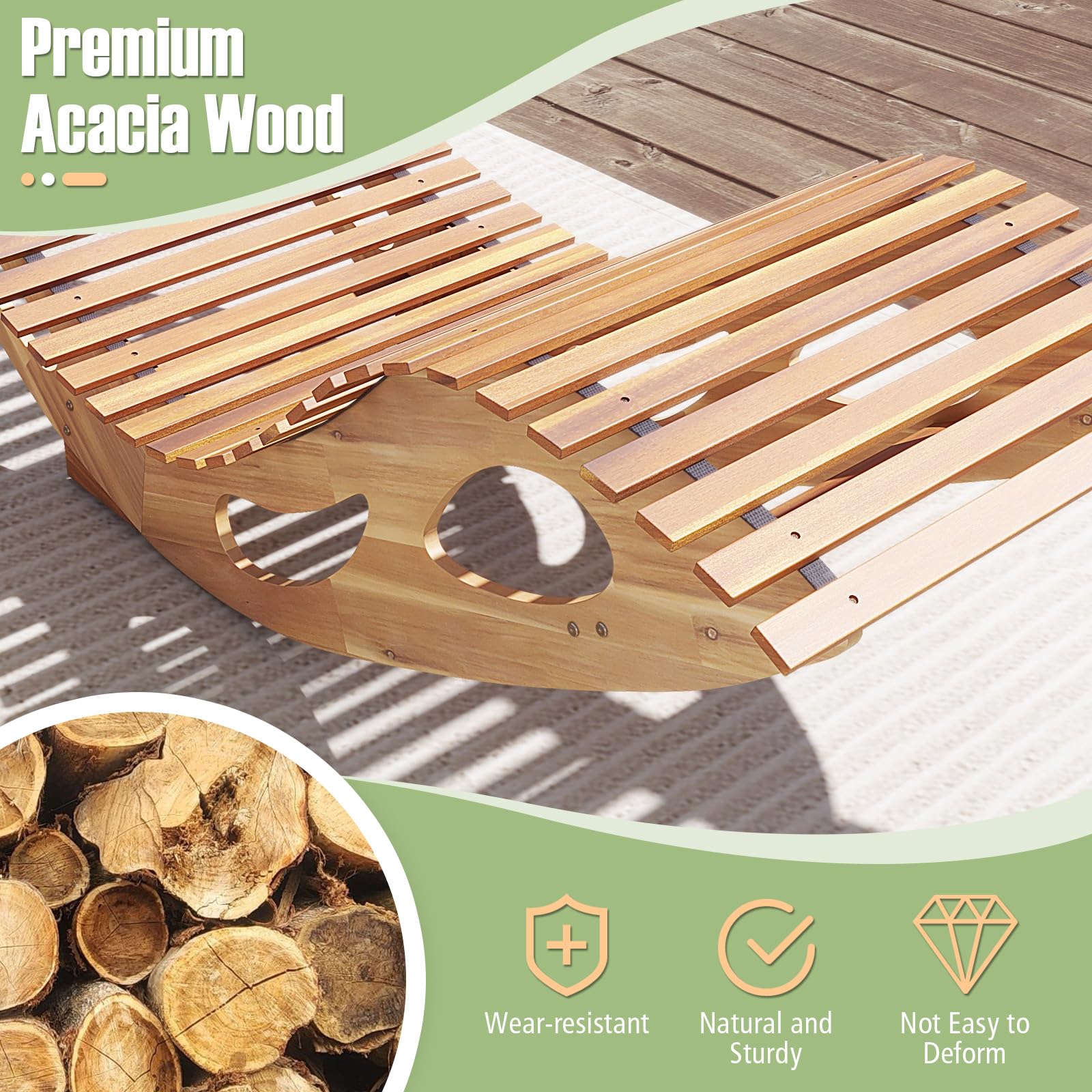 Constructed from high-quality acacia wood, this outdoor chaise lounge rocker offers a gentle rocking function with anti-tipping stoppers at the base for added safety. The natural wood ensures longevity and reliability. Moreover, the ergonomically designed seat provides optimal support, creating a comfortable seating experience. With its touch of natural charm, this wooden rocking sun lounger is a perfect spot for leisure activities such as sunbathing, reading, or napping, making it a versatile addition to your garden, patio, poolside, or any other outdoor setting.
