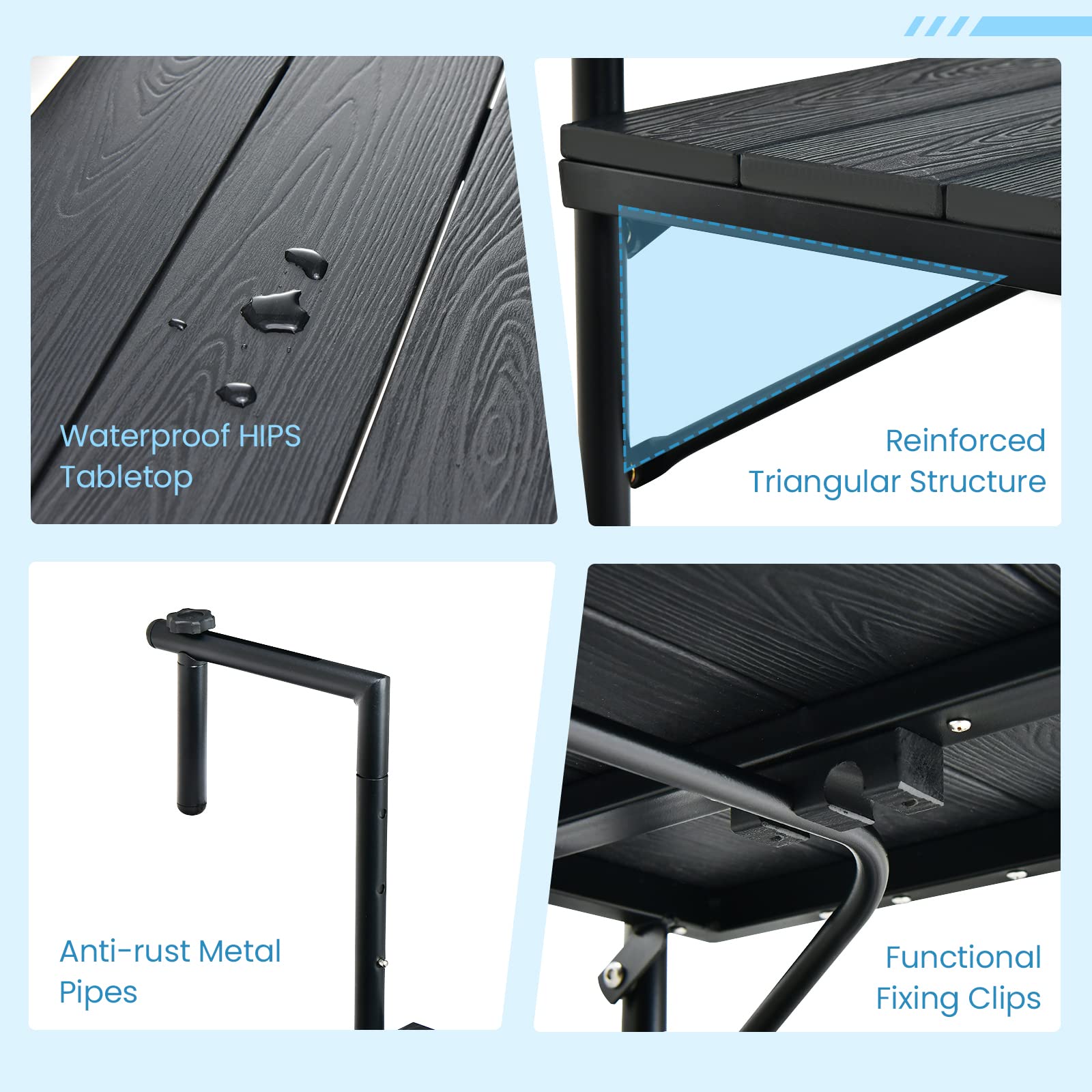 • Born for Outdoors: Made of all-weather and colorfast HIPS tabletop as well as sturdy and anti-rust metal pipes, this railing serving table withstands changing weather for a longer outdoor lifespan.