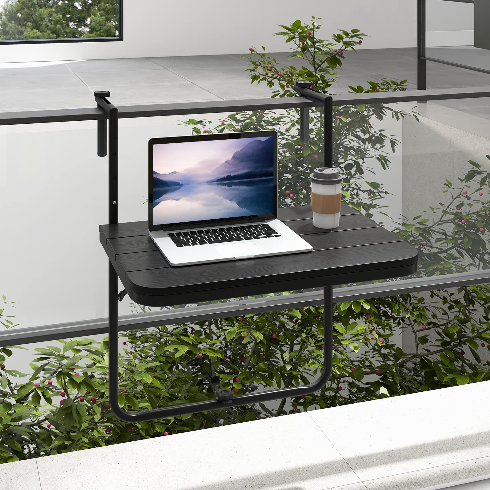 Create perfect storage space in your limited space with our outdoor railing table! This patio railing table is easy to put together without any tools. Then, you can adjust the width to match the 1"-6" railing and select the height from 3 levels to fit your chairs. Your outdoor leisure time will begin. The waterproof HIPS tabletop allows you to put various items on it. And the sturdy and rustproof metal frame will support them steadily. Hey, don't worry about the durability! The selected HIPS material takes the advantage of being all-weather, waterproof, sun-protective, and colorfast to stand against the outdoor elements. If you do not need it, just fold this patio hanging table up for space-saving.