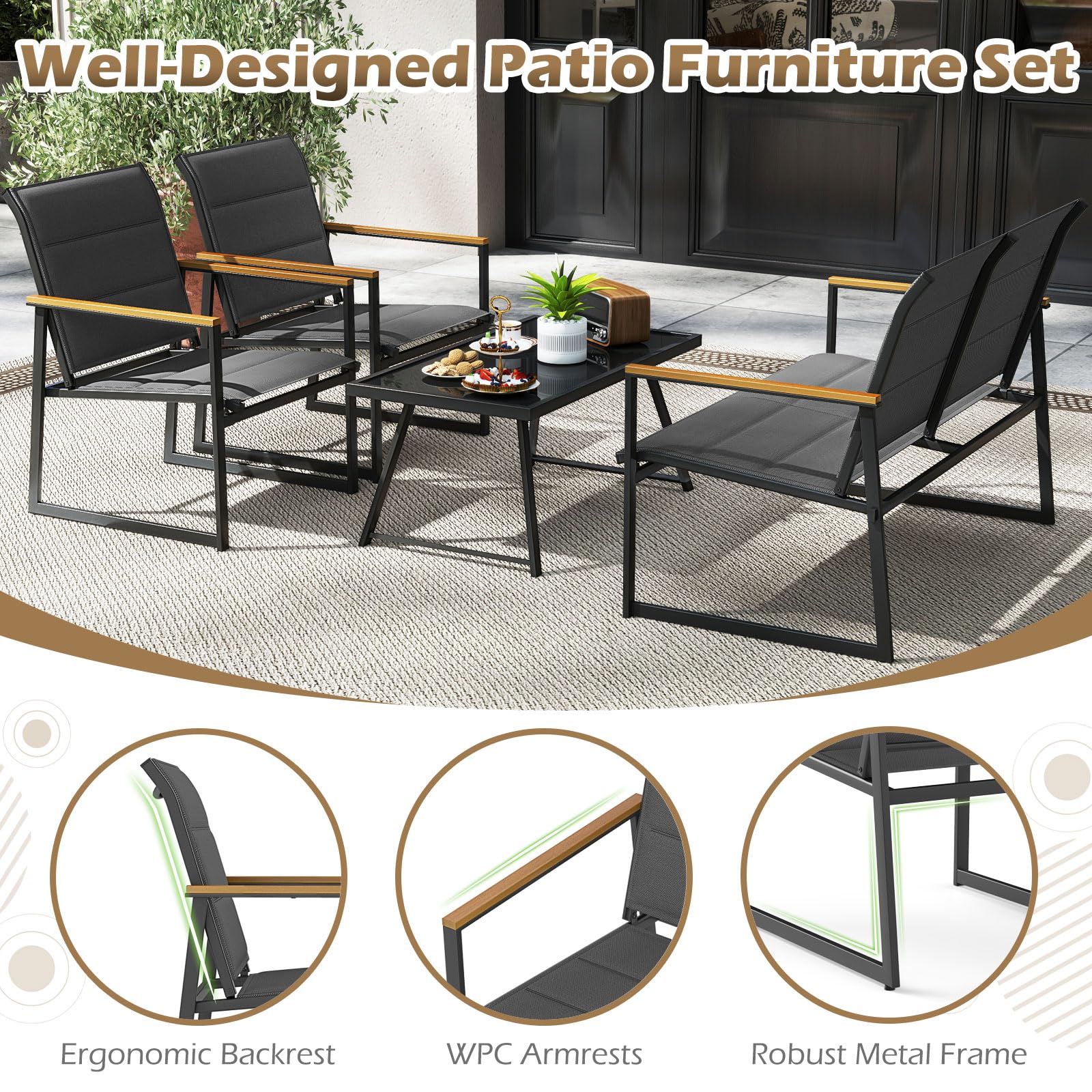 The conversation set includes cozy seats with elastic padding and breathable, quick-drying fabric. The robust metal frame ensures durability and stability, while the elegant coffee table with a tempered glass top makes it more convenient to fetch drinks or snacks. Additionally, the 4 pieces can be flexibly arranged as you need, enhancing your relaxation and style. Make your outdoor gatherings unforgettable with this well-designed patio furniture set.