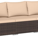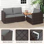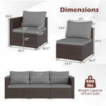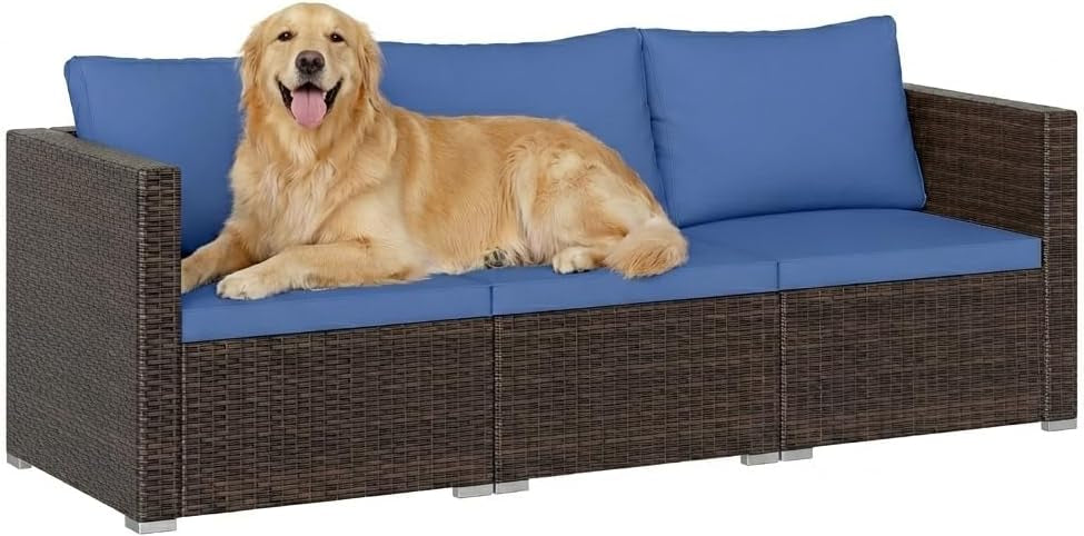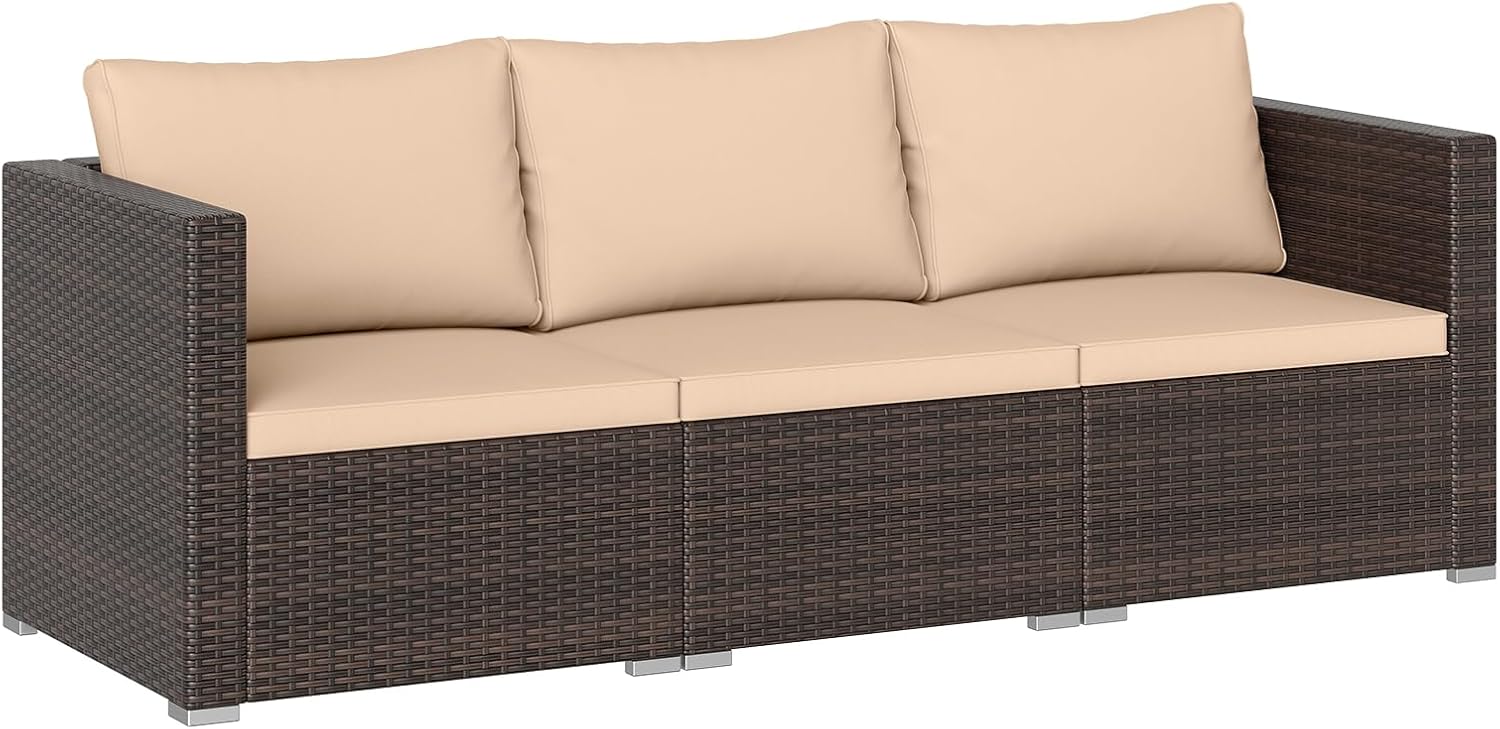 Crafted from sun-resistant PE rattan, this outdoor furniture set combines both style and durability, serving as ideal choice for patios, gardens, and poolside retreats. It comes with a right arm sofa, a left arm sofa, and an armless sofa, providing flexible configurations for various layouts and personal preferences. Featuring sponge-filled cushions with removable covers, the patio conversation set is comfortable and easy to maintain.