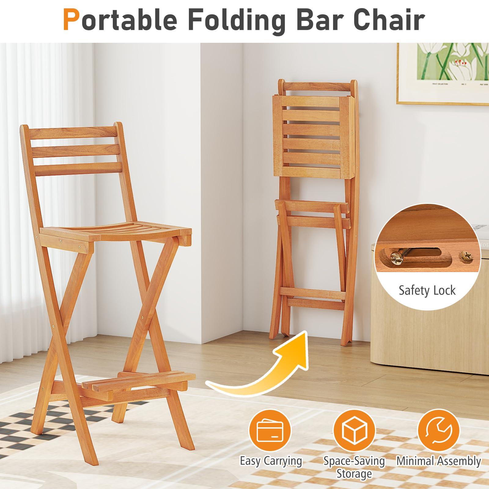 Crafted from natural acacia wood, the portable bar chair offers long-lasting elegance. The ergonomic curved seat with a 108° backrest and breathable slats enhances comfort and supports natural posture. Moreover, the stable X-shaped structure and metal brackets ensure strong support up to 400 lbs. The space-saving fold and quick setup make it ideal for backyard or porch use. This folding bar chair with well-crafted details brings effortless style and function to your outdoor living space.