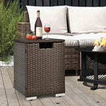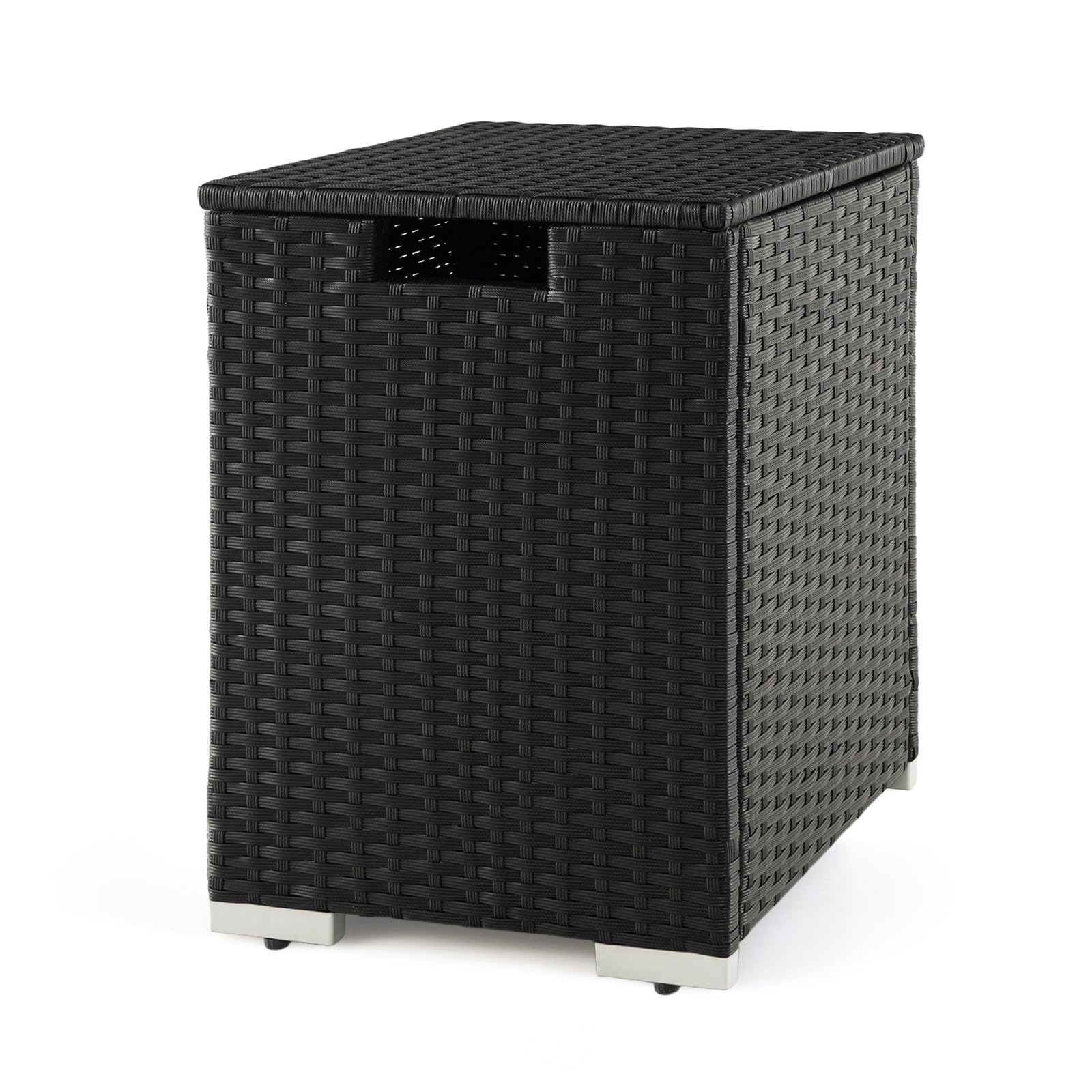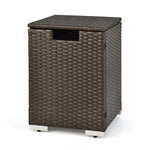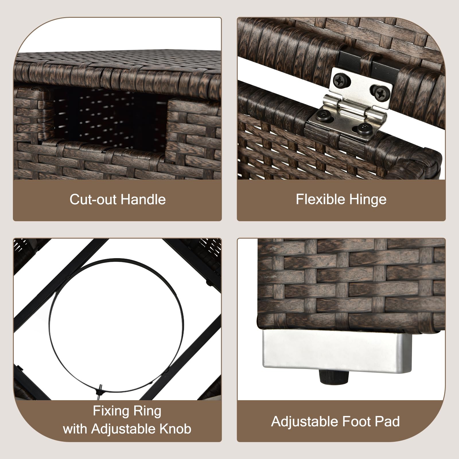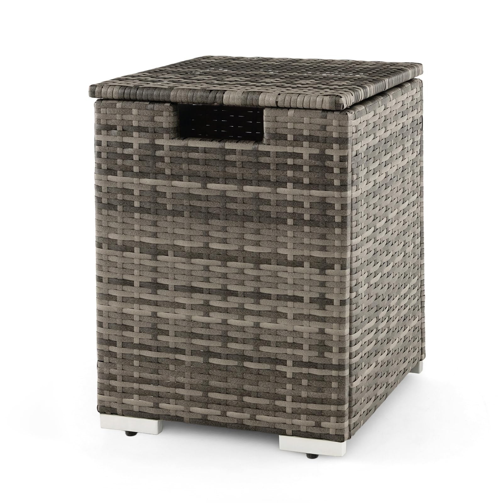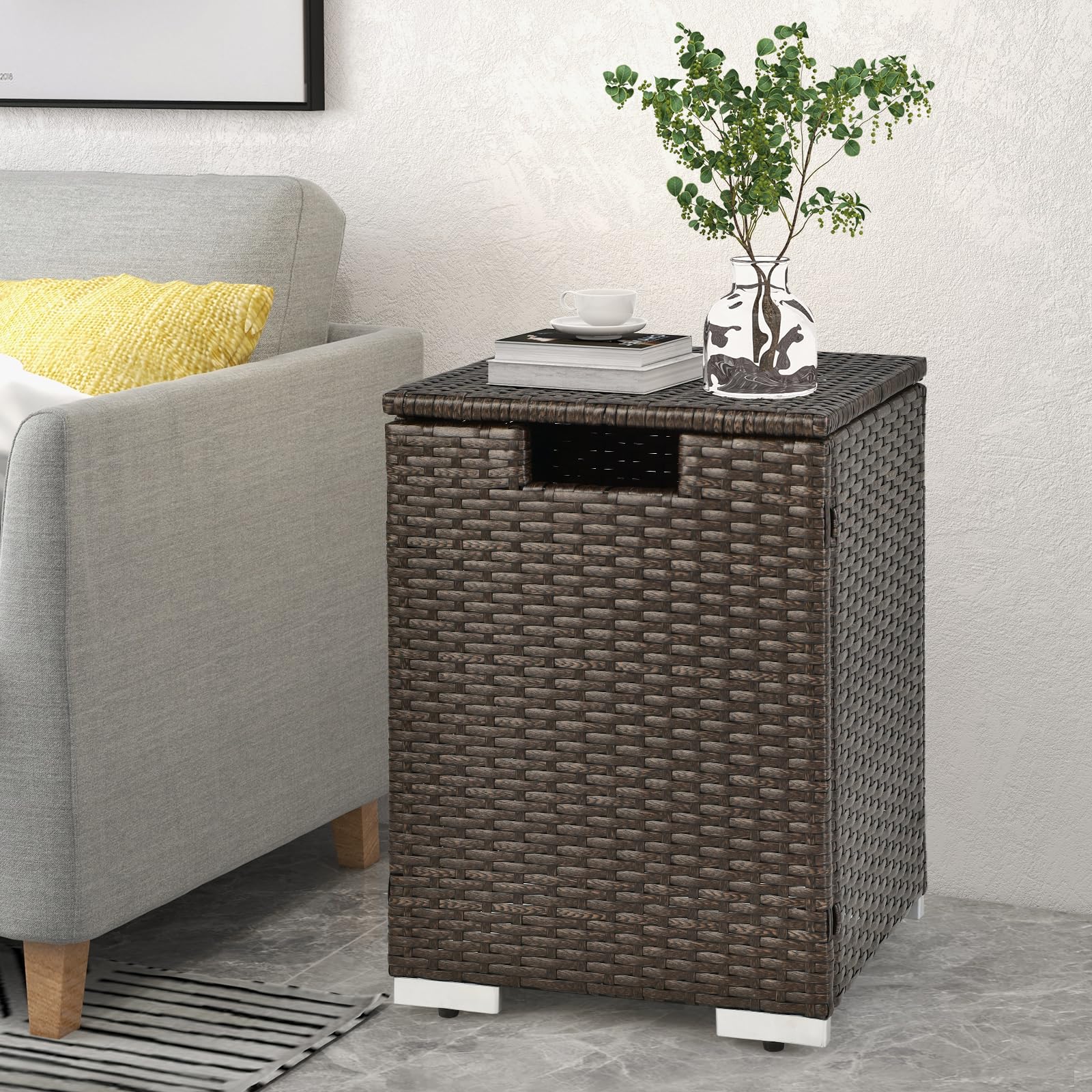 Keep the propane tank out of your sight with our patio wicker hideaway table! Through the cut-out handle and flexible hinges, the lid can be simply opened. Then, you can put the 20 lbs propane tank in it. And the fixing ring with adjustable knob keeps it balanced. After closing the lid, you can use this propane tank cover table as a side table for great convenience. No matter how long use it, this propane tank storage box will always be durable and stable thanks to the colorfast PE wicker and sturdy metal frame.
