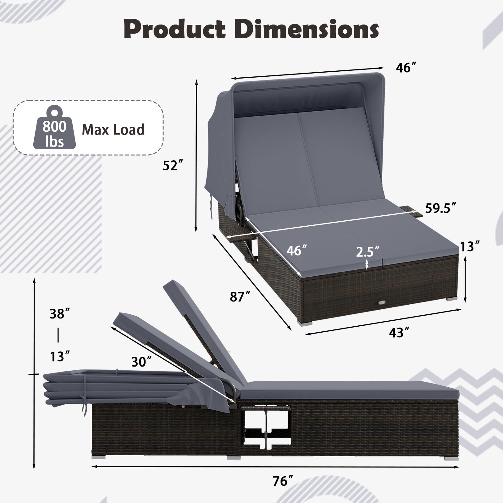 This premium double lounger features 6-level adjustable backrests, perfect for reading, sunbathing, or napping. Each backrest can be adjusted independently. And the retractable canopy protects you from harsh sunlight. Equipped with 2 full-length seat cushions, the chaise lounge will bring you optimal comfort. With a seat width of 43 inches, the double sunbed with well-made details comfortably supports up to 800 lbs and includes 2 foldable side tables for added convenience.