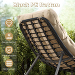 This patio set features sturdy metal frames ensuring the lawn chairs support up to 400 lbs and the side table handles up to 100 lbs, making it a stable choice for outdoor spaces. Additionally, the elegantly hand-woven PE rattan is charming and built to resist fading and sun damage. Comfort is paramount with large scooped seats in the patio papasan chairs and soft, square-tufted cushions secured with ties, promising cozy, long-lasting relaxation.