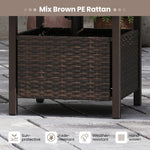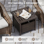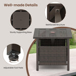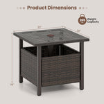 This small patio bistro table features a wood-like, square tabletop that complements your garden or patio setting, while its 19 inches height pairs perfectly with various seating arrangements, supported by adjustable foot pads for optimum balance. It boasts a rustproof frame made of zinc-iron alloy and galvanized iron, ensuring sturdy support with a maximum load capacity of 265 lbs. The built-in 1.93" umbrella hole with an adjustable screw perfectly fits umbrella poles up to 1.89", transforming it into a functional umbrella side table. Hand-woven with all-weather PE rattan, this small outdoor patio table resists the sun rays and other outdoor elements, maintaining its aesthetic appeal throughout the seasons.