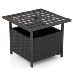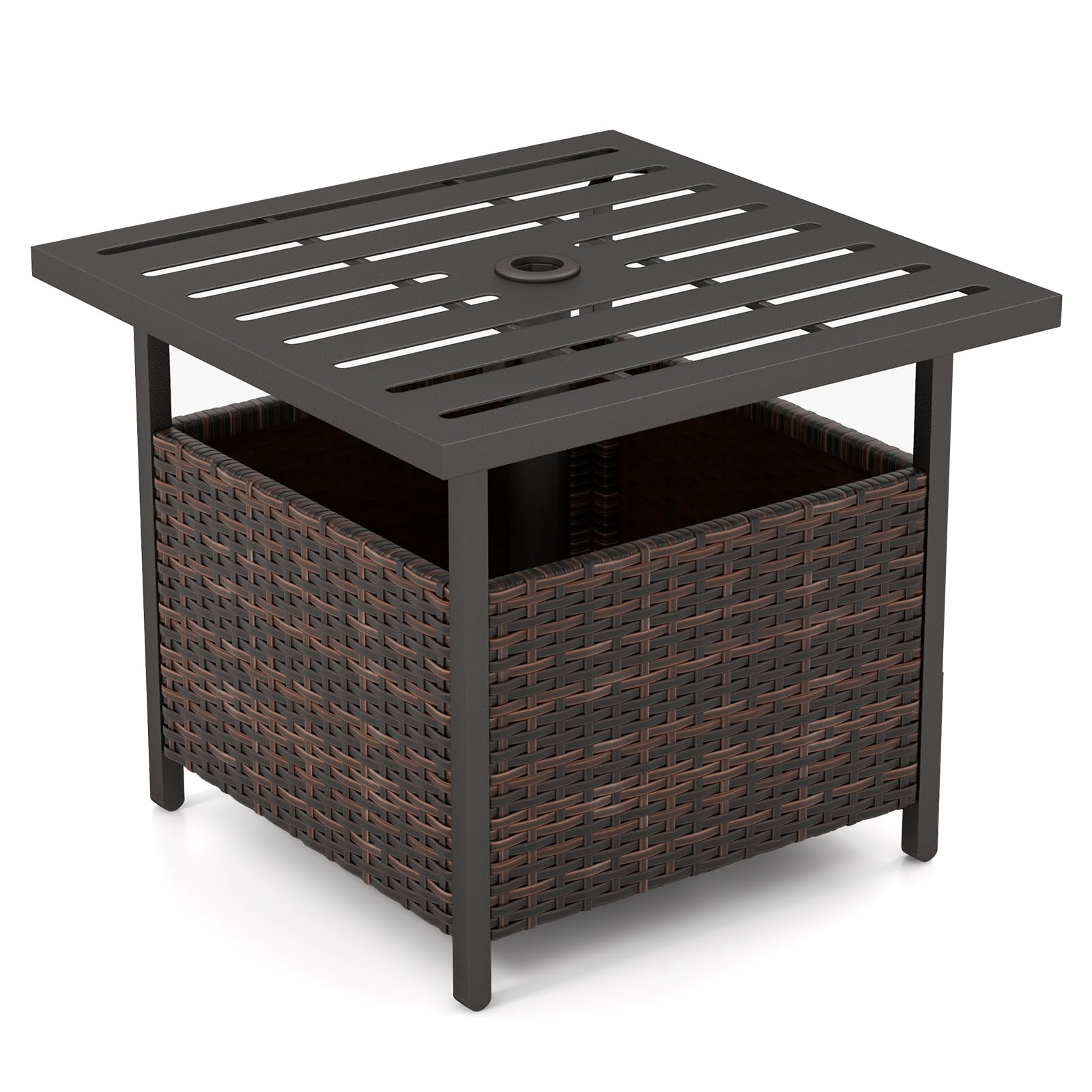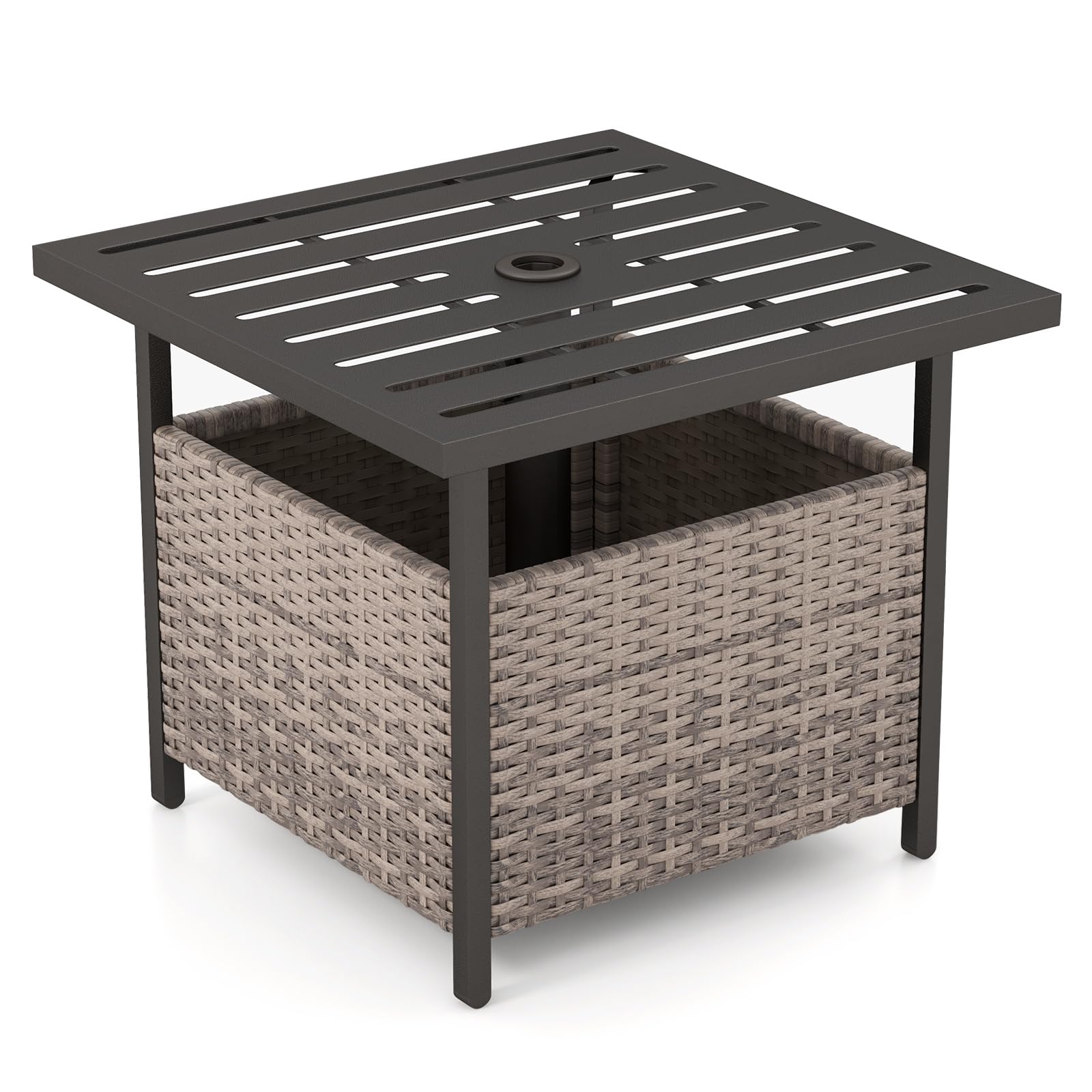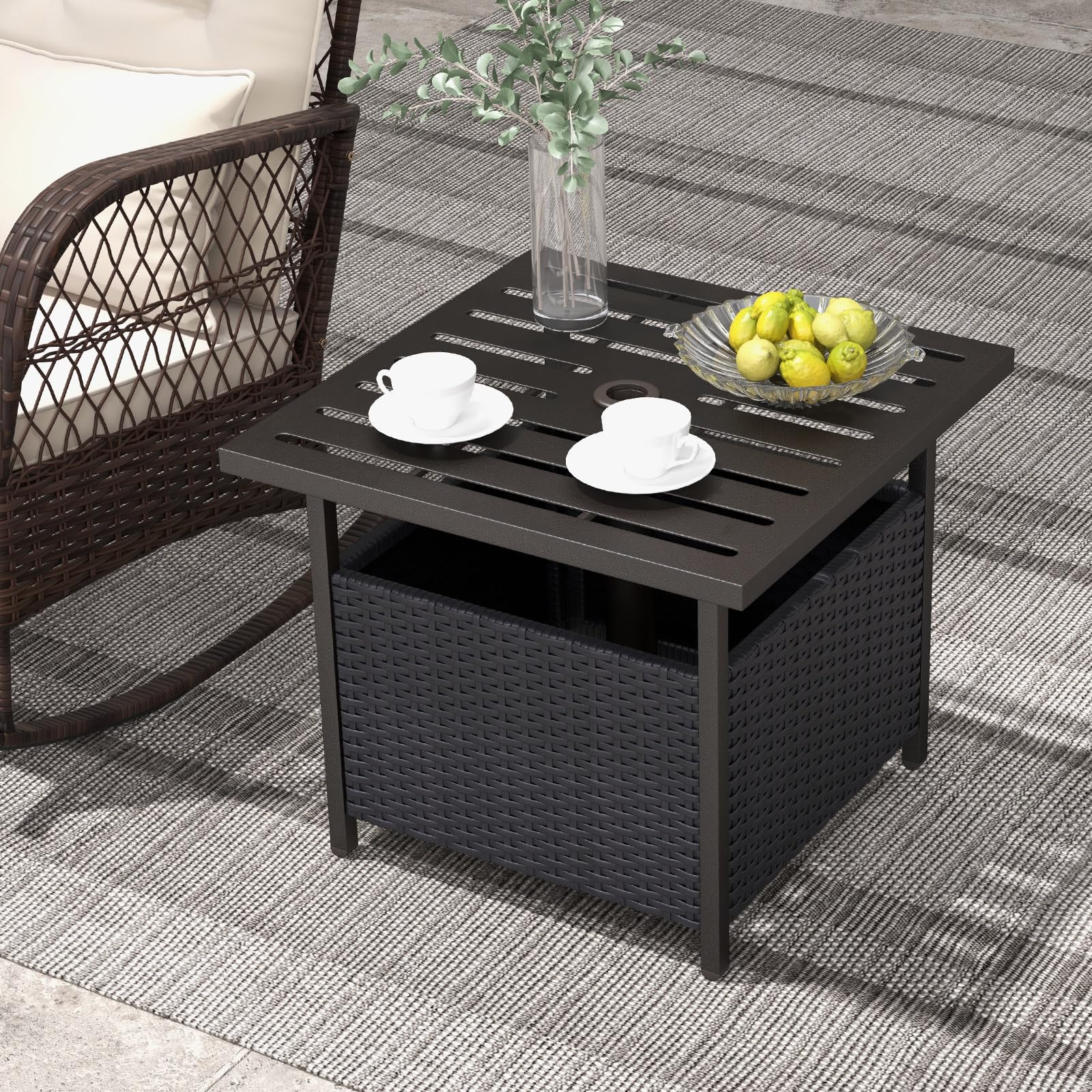 Our outdoor patio umbrella stand table is an excellent addition to your backyard for enjoying lunch, playing, eating snacks, and chatting all together on sunny days outside. Featuring fashionable style and exquisite workmanship, the patio dining table is elegant to create a whole new look for your home or yard. Constructed of the coated-powder frame and premium PE rattan, the patio furniture is durable and sturdy to ensure a long lifespan. With an umbrella hole, you can easily put your umbrella in the table to protect you from sun, rain, or wind. The anti-slip foot pads increase the umbrella stand table stability and give the table a hard surface to place drinks, snacks, or other stuff. A great choice for you to spend your leisure time outdoors and indoors!