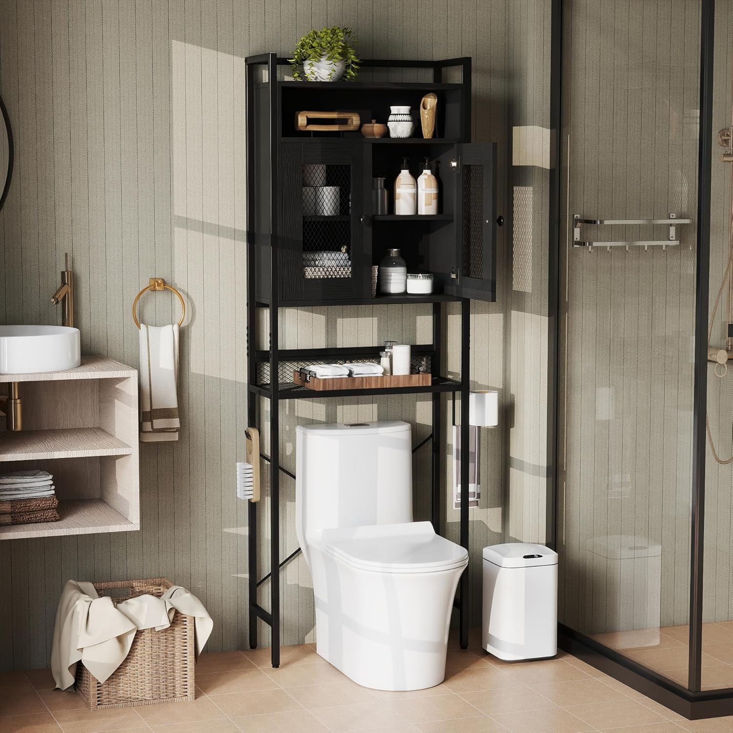 - Multiple Storage Options: Equipped with a top shelf, an open compartment, a 2-tier double-door cabinet and an L-shaped mesh shelf, this freestanding storage cabinet over toilet provides ample storage space for your bathroom or laundry essentials.