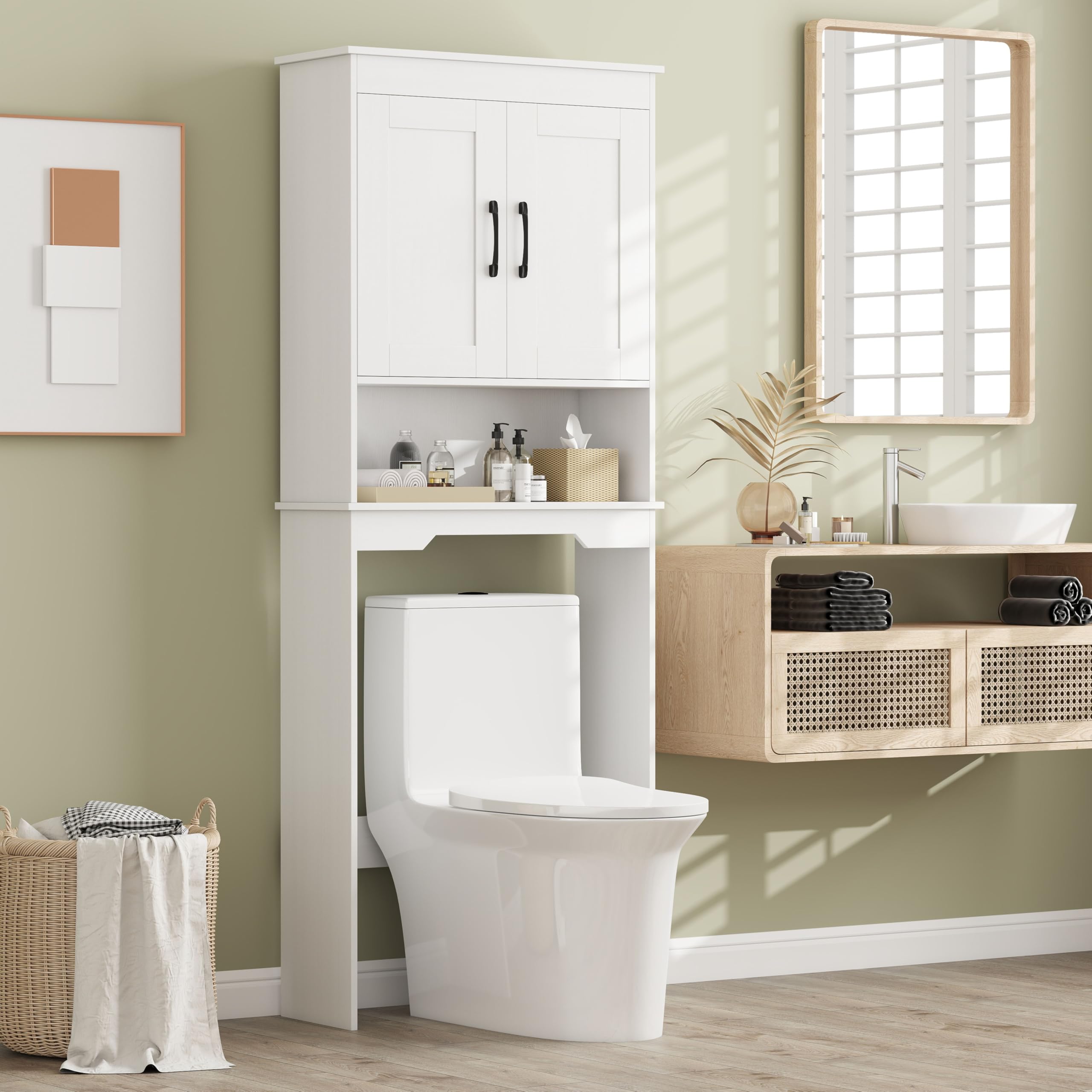 Enhance your bathroom's functionality and aesthetics with the stylish over-the-toilet storage cabinet. The standout feature is the adjustable internal shelving, which can be modified across 5 different heights, catering effortlessly to items of different sizes. Plus, the cabinet and shelf easily store a lot of things. A unique groove design ensures that the cabinet fits perfectly over the toilet lid. The bathroom organizer is built to last with sturdy materials and includes 2 anti-tipping kits for added safety, providing you peace of mind. What’s more, the space saver is ideal for either a family bathroom or a laundry room, helping you organize your space more effectively while adding a touch of elegance.