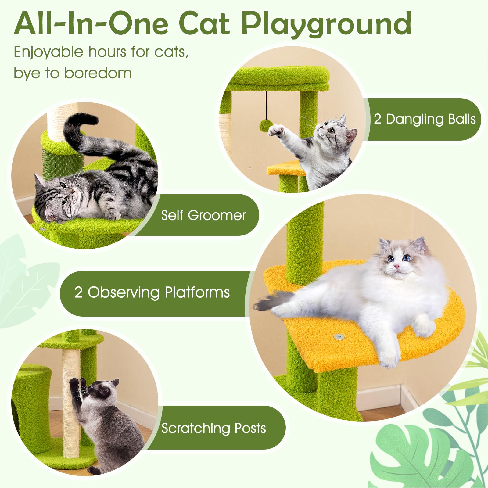 Enhance your cat’s playtime with a stable and secure cat tree boasting thickened boards and an anti-tipping kit. It is made of pet-friendly materials. This teddy fabric upholstered cat tower offers multiple cozy resting spots, including a relaxing perch and a spacious condo. For endless fun, this pet play house also includes 2 observing platforms, 2 dangling balls, a self groomer, and scratching posts. Ideal for small spaces, this 48” activity center maximizes vertical play area, providing ample room for your pet to stretch and explore. Its artificial palm design with lifelike silk leaves not only adds a natural appeal to your home decoration but also stimulates your cat’s climbing instincts.
