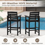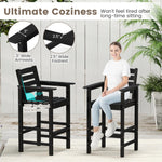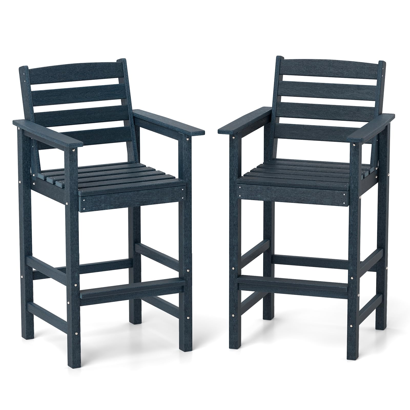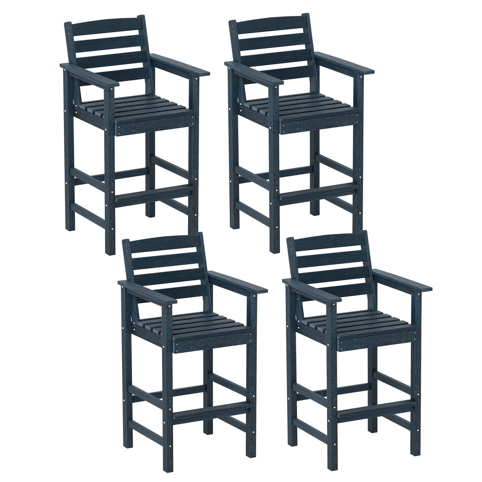 The 2/4 bar chairs are meticulously crafted from all-weather HDPE material and equipped with robust stainless steel screws, ensuring high stability and extended outdoor use. Each seat features a 105° inclined backrest, 3" wide armrests, and a 2.5" wide footrest, so you won't feel tired after long-time sitting. The faux wood texture and classic Adirondack design add an element of sophistication to any outdoor setting, making these high-top chairs perfect for use alongside 39.5" to 45.5" high bar tables. These 4 bar chairs with well-crafted details will elevate your outdoor spaces with both style and ease.
