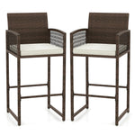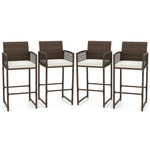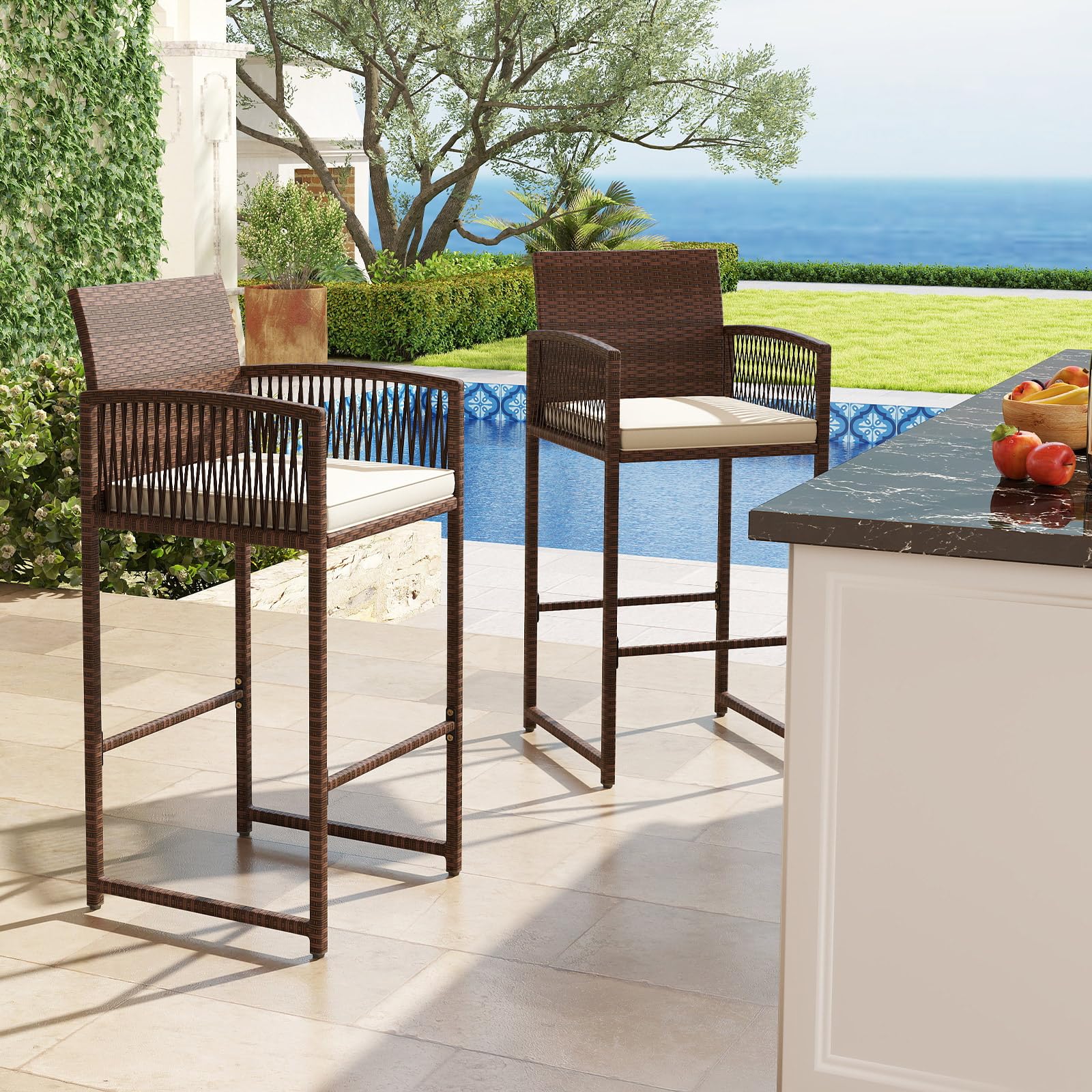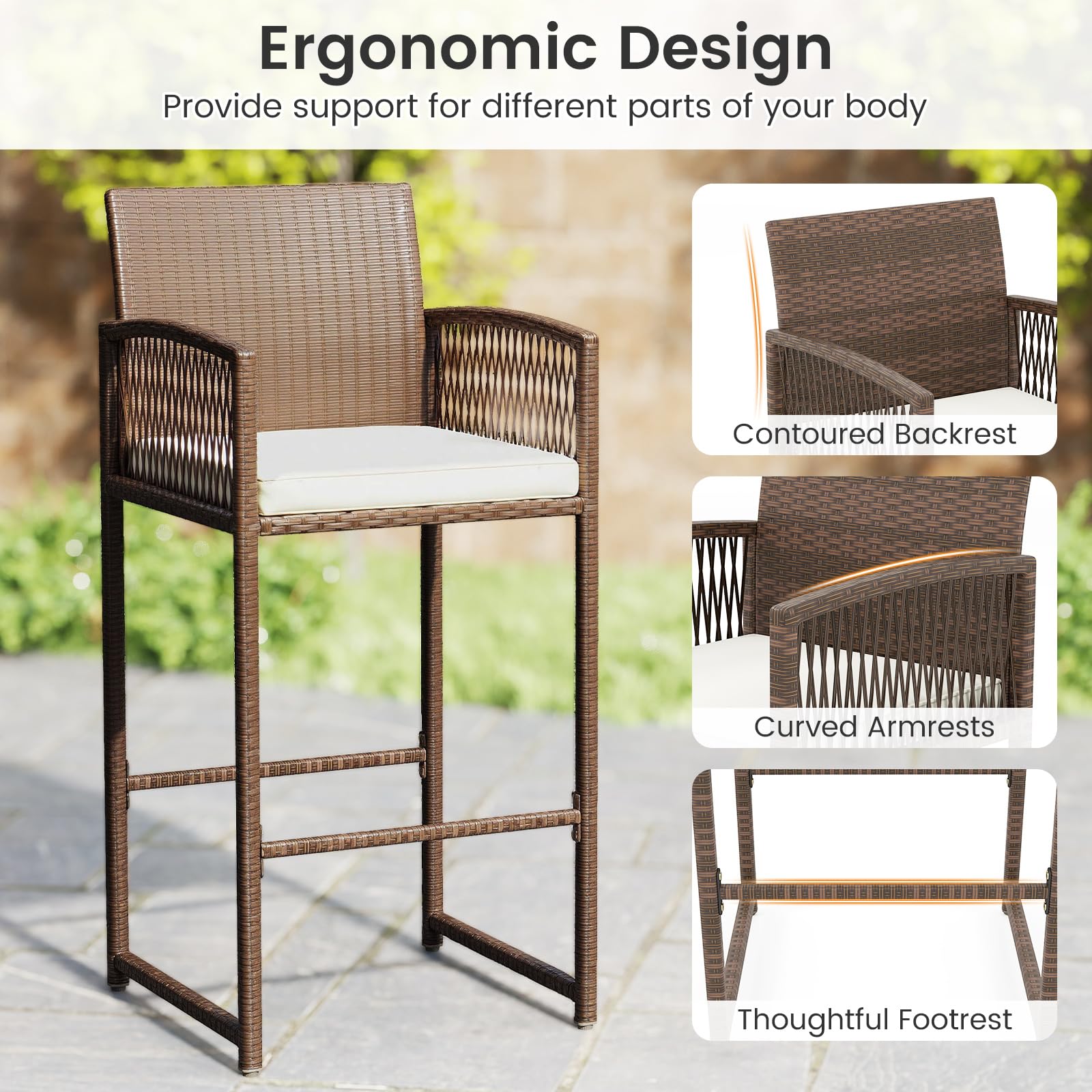 Crafted with premium PE rattan and sturdy metal frames, these bar height chairs promise to withstand the test of time. Moreover, these patio barstools feature inclined backrests, curved armrests, and built-in footrests to enhance your relaxation experience. The sponge-filled seat cushions offer additional coziness, and their removable covers make maintenance a breeze. Perfect for bar tables ranging from 39"-43" high, these PE wicker bar stools are an ideal choice for various outdoor spaces such as patios, gardens, and backyards.