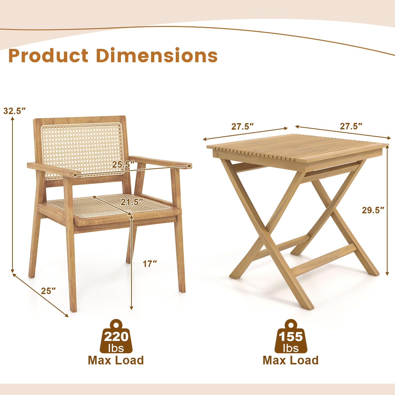 - High-Grade Teak Wood: The whole bistro set is made of premium teak wood which is sturdy and crack-resistant for long-time use. And the water-based vanished surface is burr-free and easy to maintain.