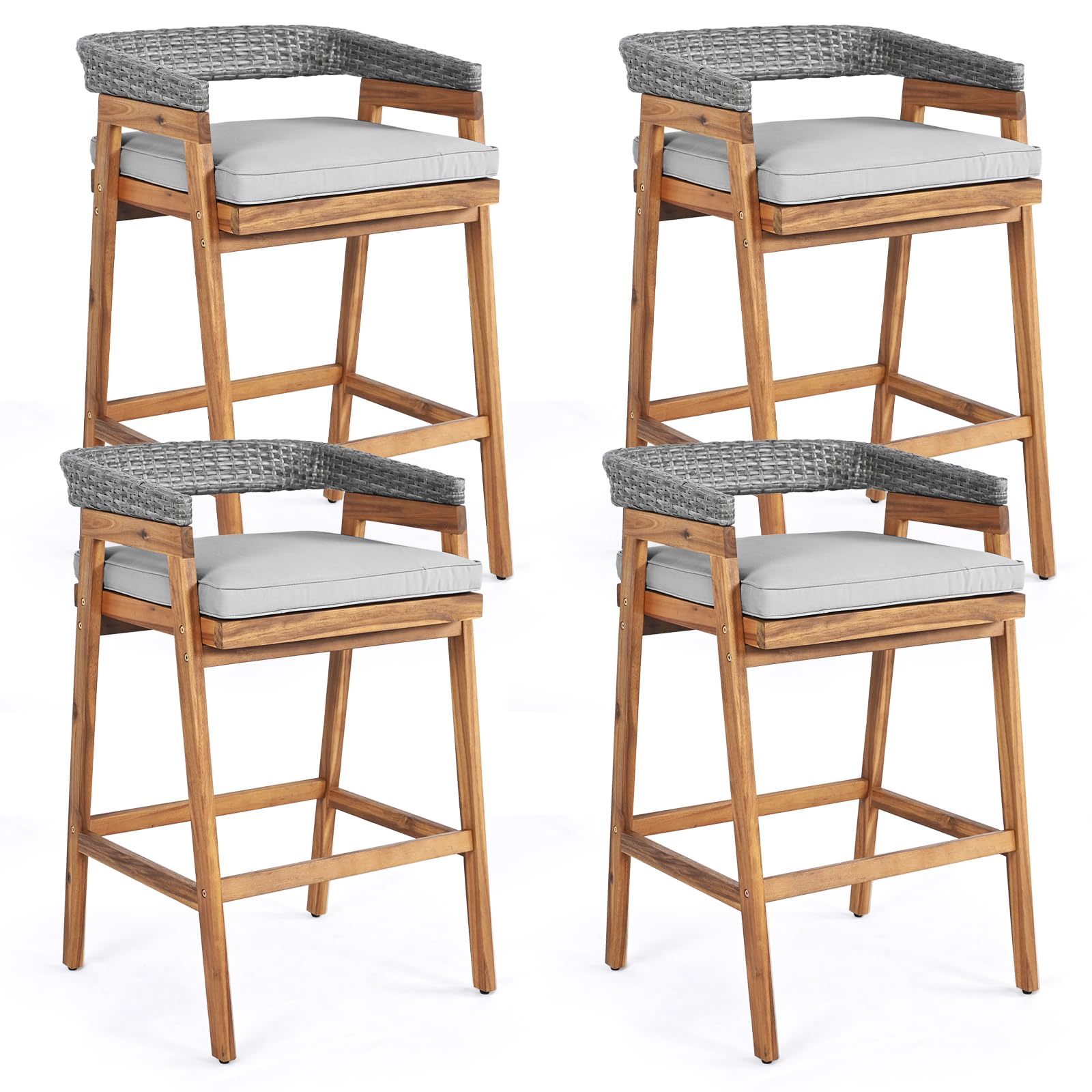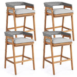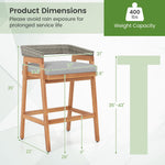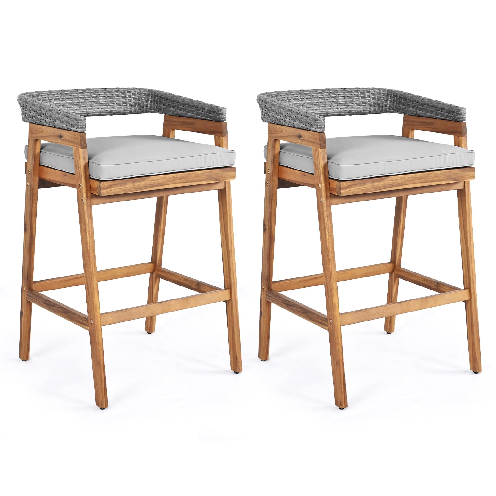 These outdoor bar chairs beautifully combine natural acacia wood and stylish PE wicker for a chic look and strong stability. Moreover, the soft cushions with removable covers not only provide a comfortable seating experience but also make maintenance a breeze. The ergonomic design is enhanced with PE wicker backrests and built-in footrests, ensuring both style and comfort. Suitable for table heights between 35"-43", these counter height patio chairs with 26.5" seat heights (without cushions) promise wide application in your garden, deck or backyard.