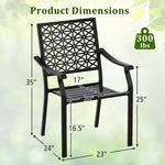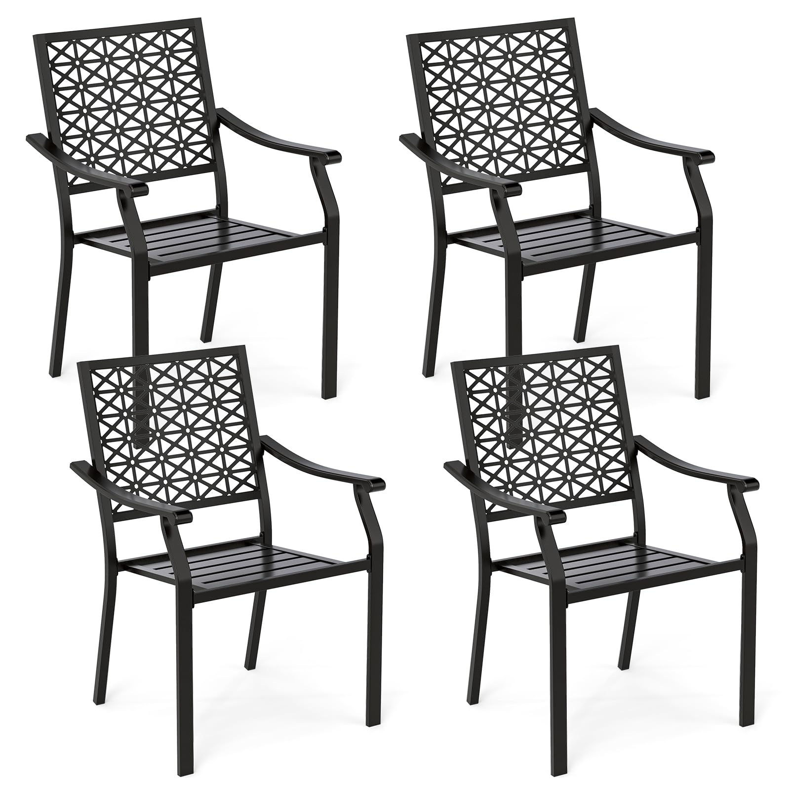 These outside chairs feature a sturdy metal construction ensuring stable and reliable support, topped with an exquisite geometric lattice design on the backrest for a touch of sophistication. Moreover, the 105° inclined backrest, curved armrests and slatted seat endow each metal patio chair with ergonomic comfort, ensuring you relax in style and ease. For added convenience, these patio bistro chairs boast a stackable design for compact storage and space-saving.