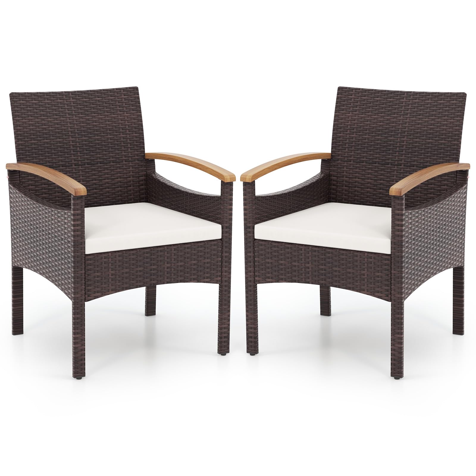 Made from premium mix brown PE wicker, these chairs are designed to be sunproof and anti-fading, promoting long-lasting use and enjoyment. Each chair includes a soft cushion for more comfort. And the removable zippered cover is designed for easy cleaning. Moreover, the robust metal frame enables each chair to support up to 400 lbs. The elegant design, highlighted by curved acacia wood armrests, enhances relaxation and adds a sophisticated touch to your relaxing space. Ideal for dining or relaxing, these chairs are suited for various settings like the backyard, poolside, or balcony. Embrace the blend of comfort and elegance with the versatile patio chairs, designed to enhance your outdoor living experience.
