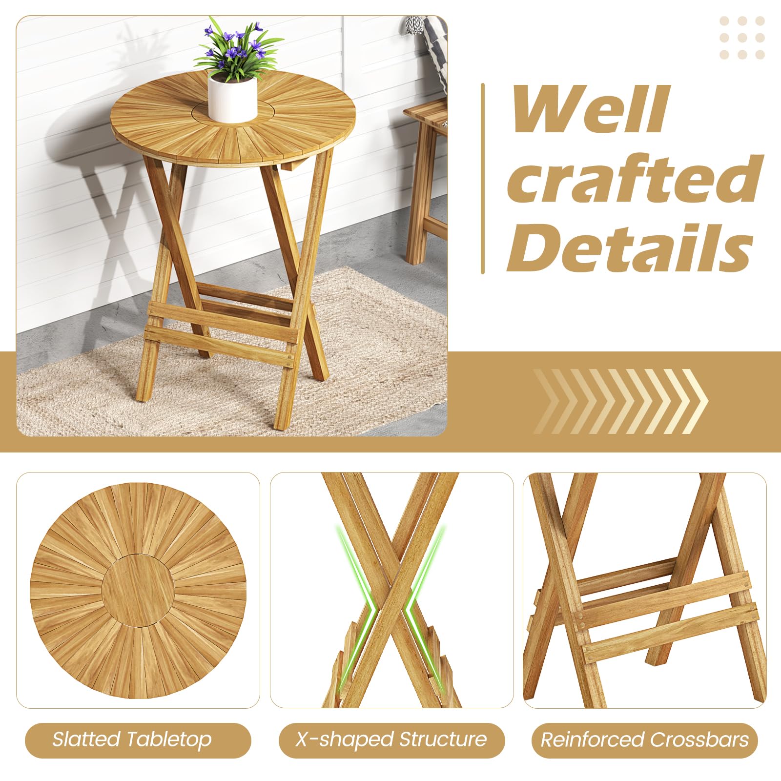 Made of premium teak wood, the outdoor end table boasts longer life span and higher sturdiness. Plus, the X-shaped frame supports the bistro table securely. You can fold and unfold the side table for quick set up and take down, providing a versatile and practical surface wherever needed. This compact design ensures that the side table can be effortlessly tucked away when not in use. Perfect for hosting drinks, displaying plants, or holding books as you relax outdoors or indoors, this end table combines practicality with an understated elegance.