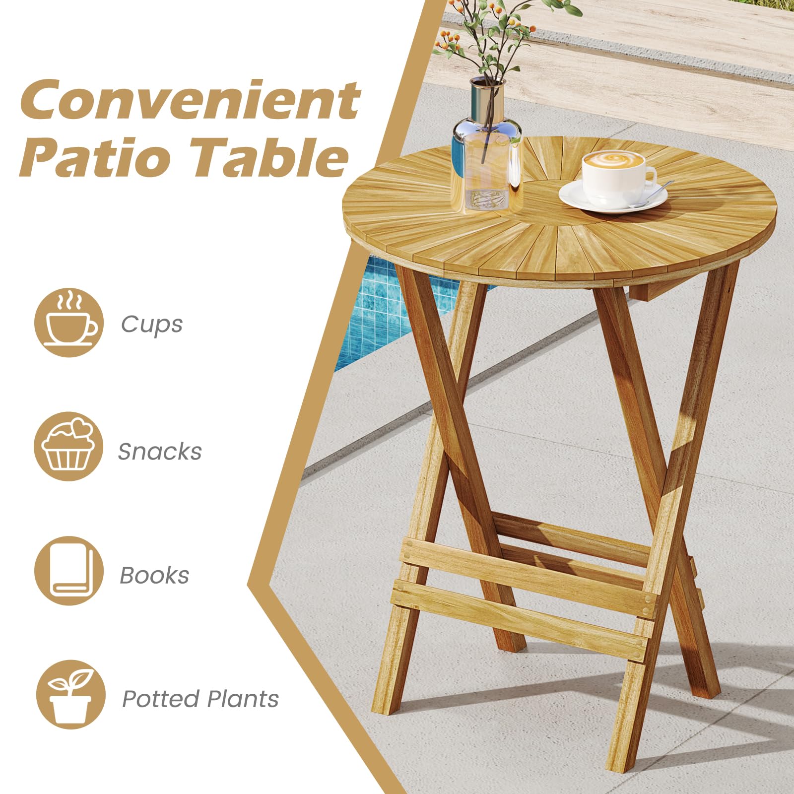 - Round Slatted Tabletop: The slatted tabletop enhances visual effect with its classic patterns. Additionally, any daily items placed on the tabletop can be easily accessible, such as books, cups, snacks and potted plants.