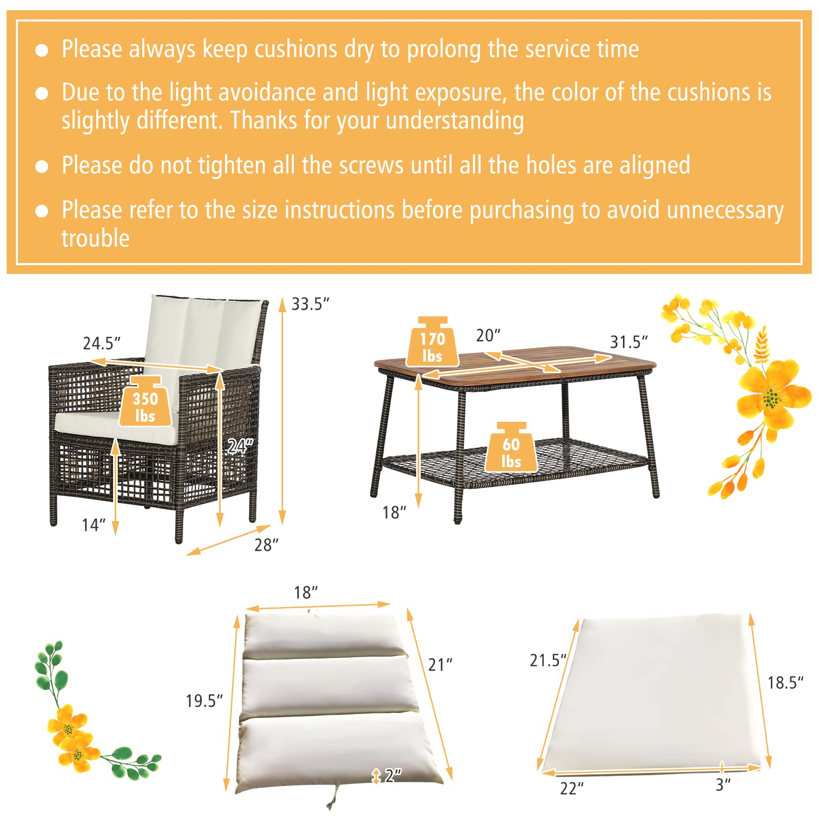 Featuring ergonomic armrests, softly padded back, and seat cushions, this outdoor conversation set brings extraordinary comfort so that you can use this cozy patio set to entertain your friends and guests. Additionally, the rectangular coffee table provides sufficient storage space thanks to the large acacia wood tabletop and extra open shelf. What??s more, no matter where you put this outdoor furniture set, it will always fit because it comes with multiple combinations to match your outdoor places. And the weather-resistant PE rattan and rustproof steel frame make this outdoor sofa set durable and stable for long-time outdoor use.