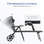 - 7-position Adjustable Backrest: This patio lounge chair possesses a premium locking system underneath the two armrests, providing you with 7 different reclining positions to choose from. You can adjust the backrest to the desired angle by lifting the armrests, and then you can either sit or lay flat on the lounge chair.