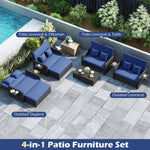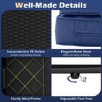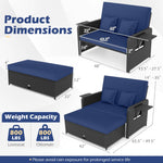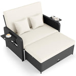 Hand-woven and sun-protective PE rattan wrapped a metal frame rated to 800 lbs on both the loveseat and its ottoman, so this outdoor sofa bed ensures long-lasting durability and reliable support. The 4-level adjustable backrest allows you to customize your seating or reclining position. Plus, this patio furniture set features soft cushions and throw pillows for a comfortable lying experience. The folding side tables hold drinks without stealing floor space. In addition, the ottoman with hidden storage completes the set by transforming into a footrest, coffee table or extra seat, making this 2-person patio recliner lounger more ways to use.