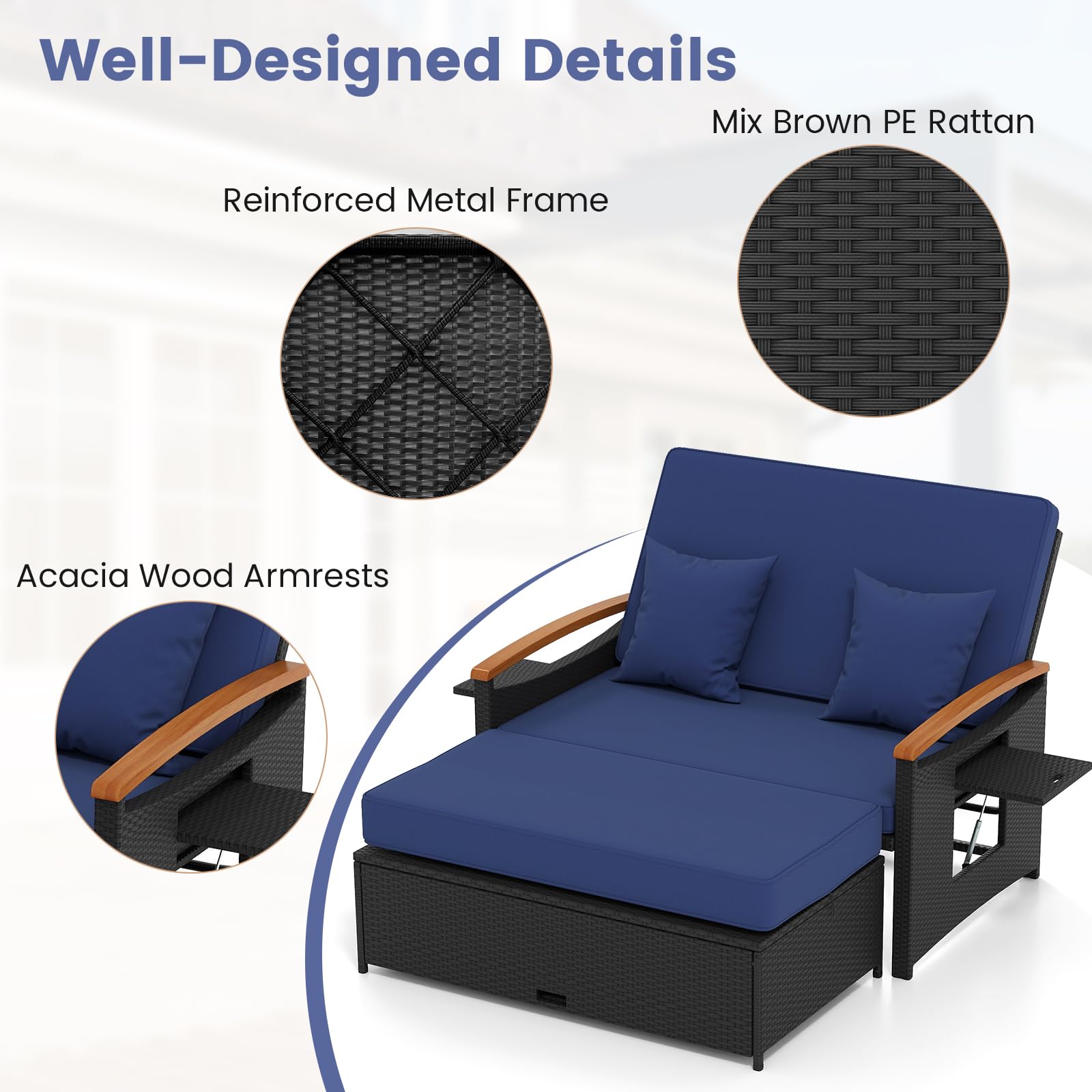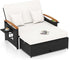 Indulge in ultimate comfort, versatility and style with this outdoor patio rattan daybed set! Whether you wanna sit, lie or have space to store items, this multifunctional outdoor furniture set always meets your needs because it features 3 ways to use it: cushioned loveseat, daybed or loveseat and coffee table set. The way to get a coffee table is simple, just open the front door of the ottoman and put the ottoman cushion in it. Apart from that, the loveseat is designed with retractable side trays to provide more storage space. It’s worth mentioning that this double chaise lounger comes with 4-level adjustable to meet your different needs. No matter which way you choose to use, the soft padded cushions make you feel comfortable all the time.