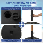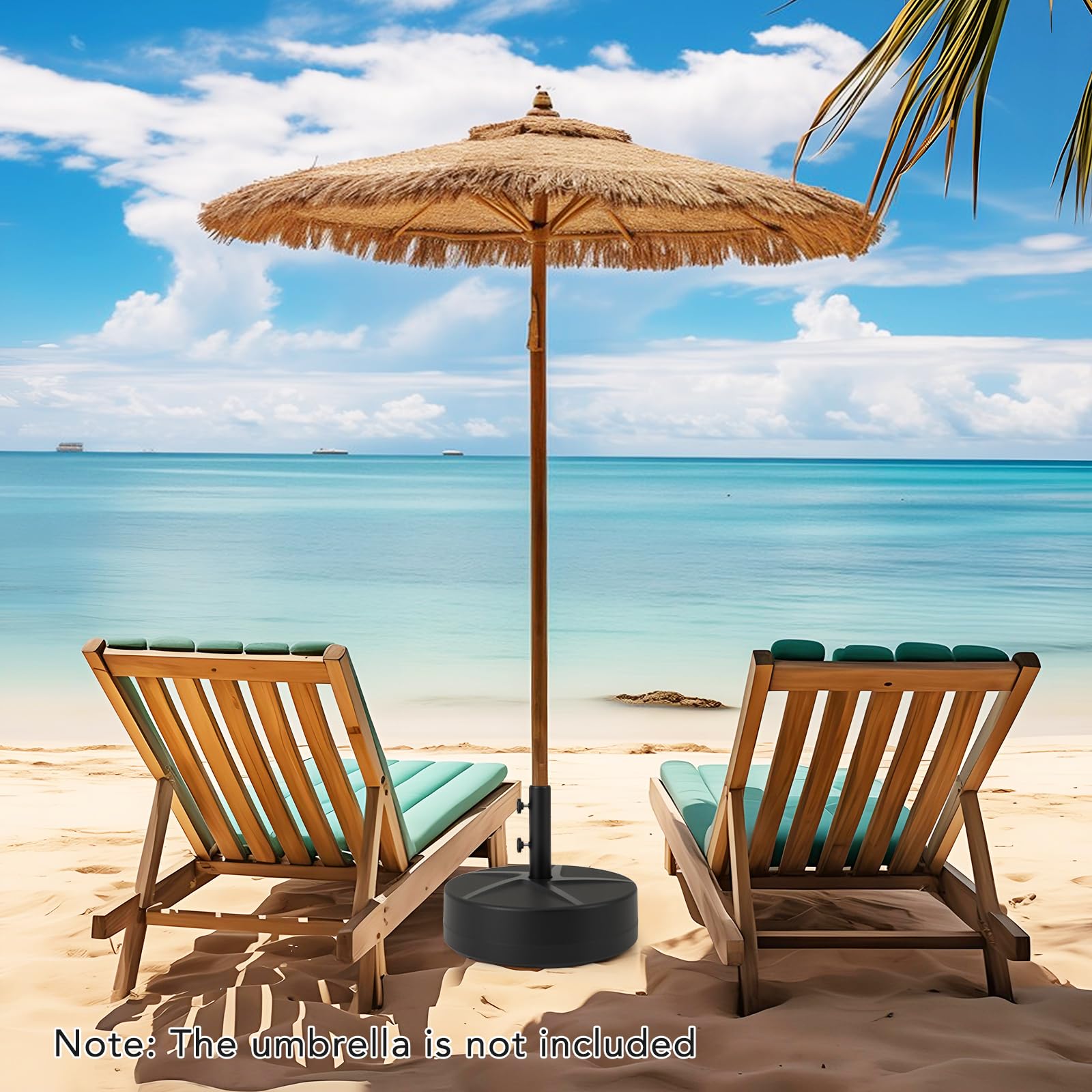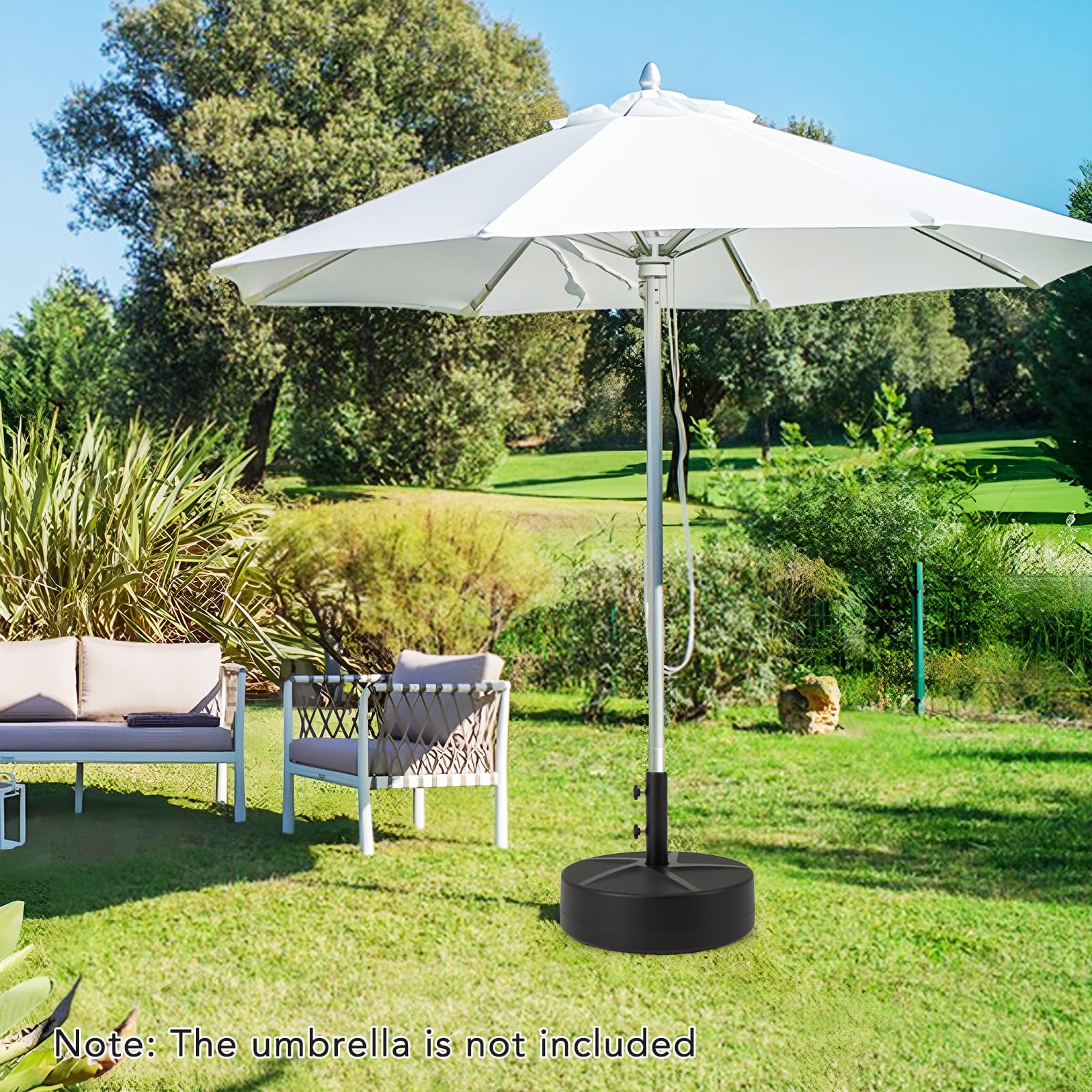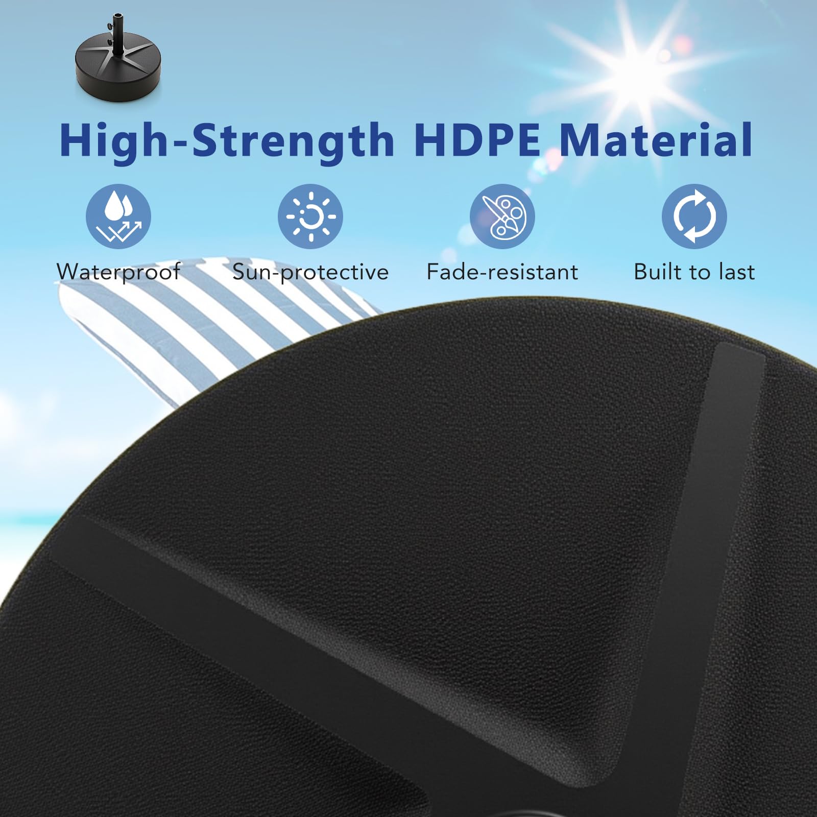 Our patio umbrella base measures 20" x 16"/50 x 40 cm (Dia. x H) and features 3 adapters, which are compatible with patio umbrellas with 1.89"/1.5"/1.42", 48/38/36 mm pole diameters (Warm tips: Please check your umbrella size before purchase). To keep your umbrella stable and secure, the base can be filled with 57 lbs/26 kg water, 66 lbs/30 kg sand, or 88 lbs/40 kg sand and water. Additionally, this umbrella stand, constructed from robust HDPE material, offers unparalleled durability and weather resistance, ensuring it remains vibrant and deformation-free over time. Installation is also a breeze, allowing you to set up it swiftly without any need for additional tools. Whether setting it beside a pool, on a sunny beach, in a tranquil garden, or paired with outdoor dining tables, our fillable umbrella base is the perfect companion to any outdoor setting.