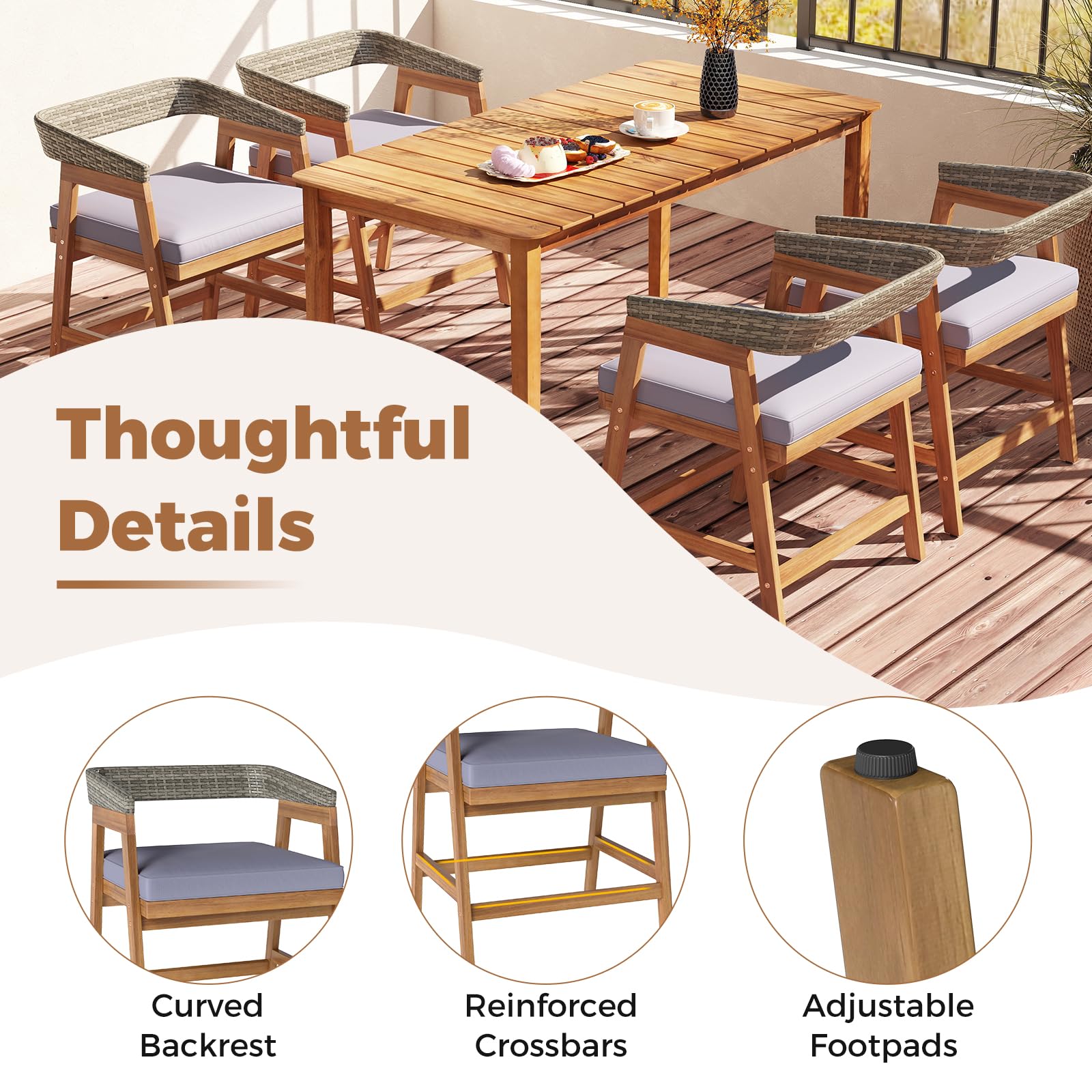 Experience superior comfort and style to your outdoor spaces with this set of 4 patio wicker dining chairs. Each chair is constructed with acacia wood frame and rattan backrest, ensuring extended use and high stability. The design of crossbars and adjustable footpads also strengthens the overall structure. Each patio chair is accompanied by a cushion filled with soft and elastic sponge. And the curved backrest brings more comfort to you. These outdoor chairs with thoughtful details will bring coziness and elegance, making them ideal for multiple occasions like backyard, poolside, front porch and so on.
