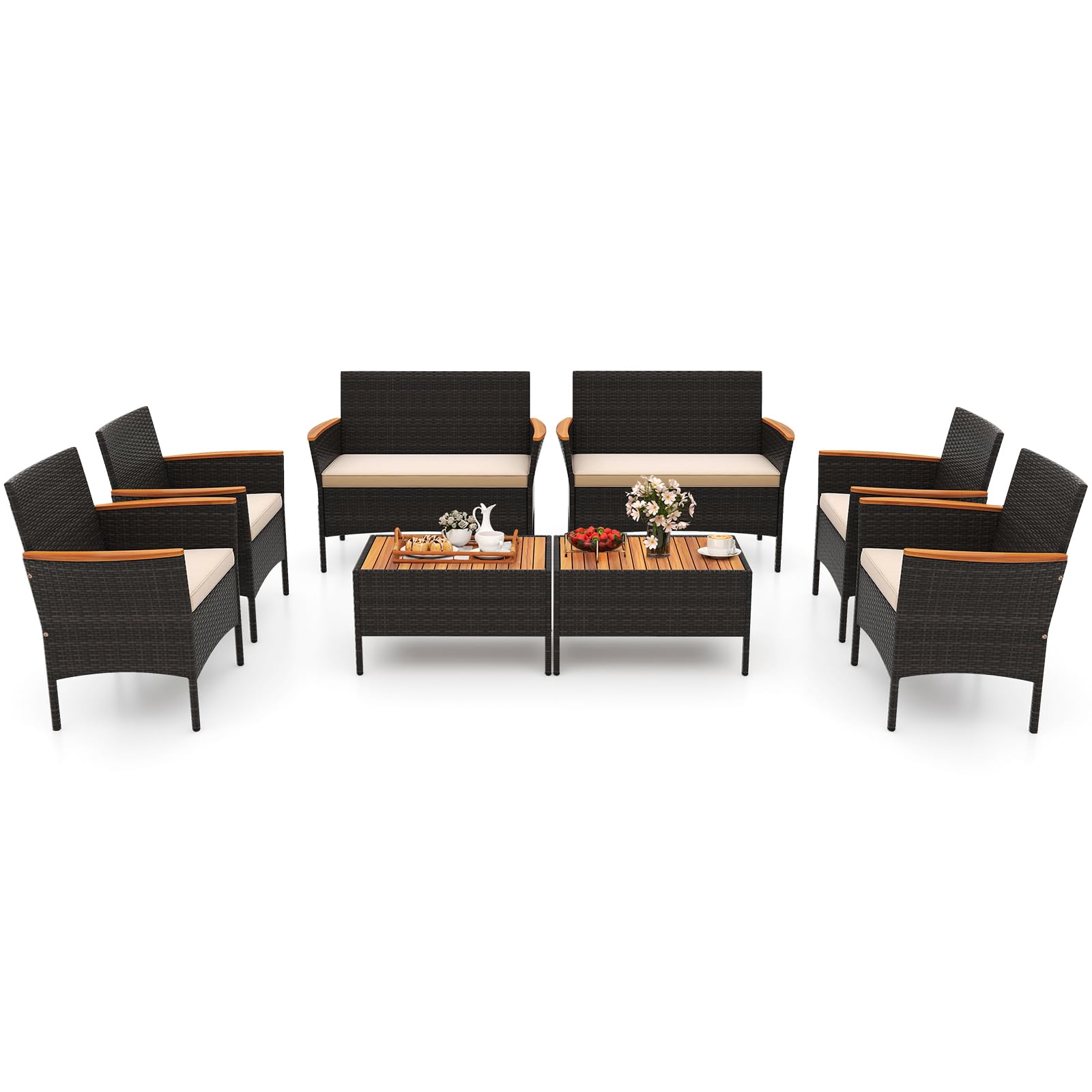 - Ergonomic Design: The loveseat and armchairs of this outdoor conversation set feature cozy wood armrests and ergonomic backrest to offer ultimate comfort. Additionally, the stylish coffee table offers convenience to fetch drinks and snacks.