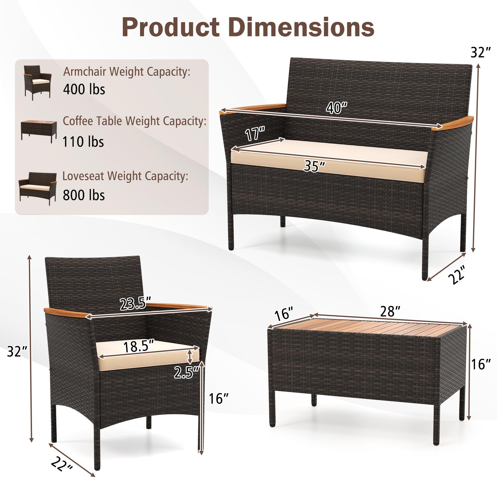 - Versatility in Use: The 4 pieces of this patio sofa set can be arranged flexibly to fit different sizes of areas, ideal for placement by the poolside, garden, or backyard. Dimension of loveseat: 22" x 40" x 32" (L x W x H). Dimension of armchair: 22" x 23.5" x 32" (L x W x H). Dimension of coffee table: 28" x 16" x 16" (L x W x H).