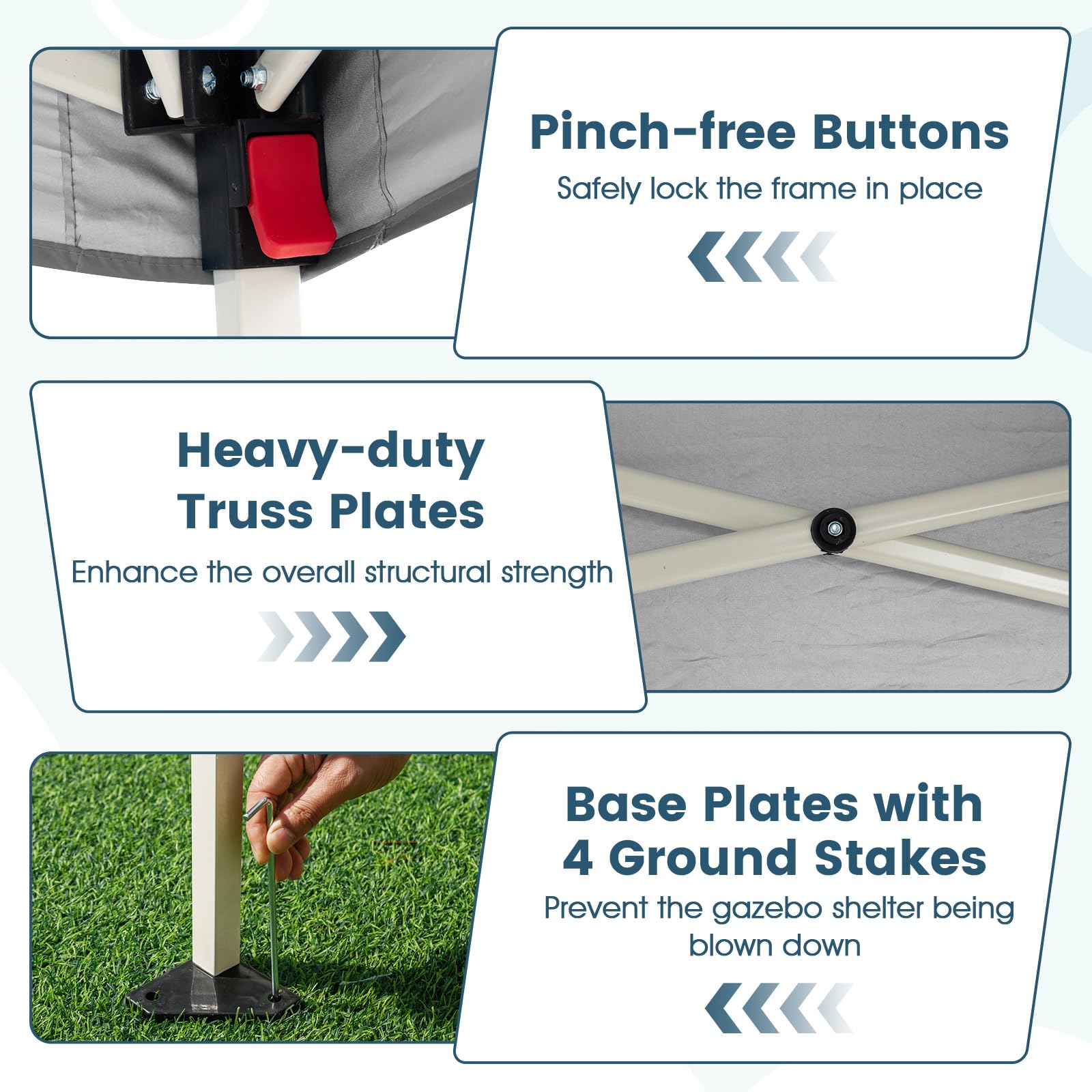 Pinch-free buttons allow you to safely lock the frame in place