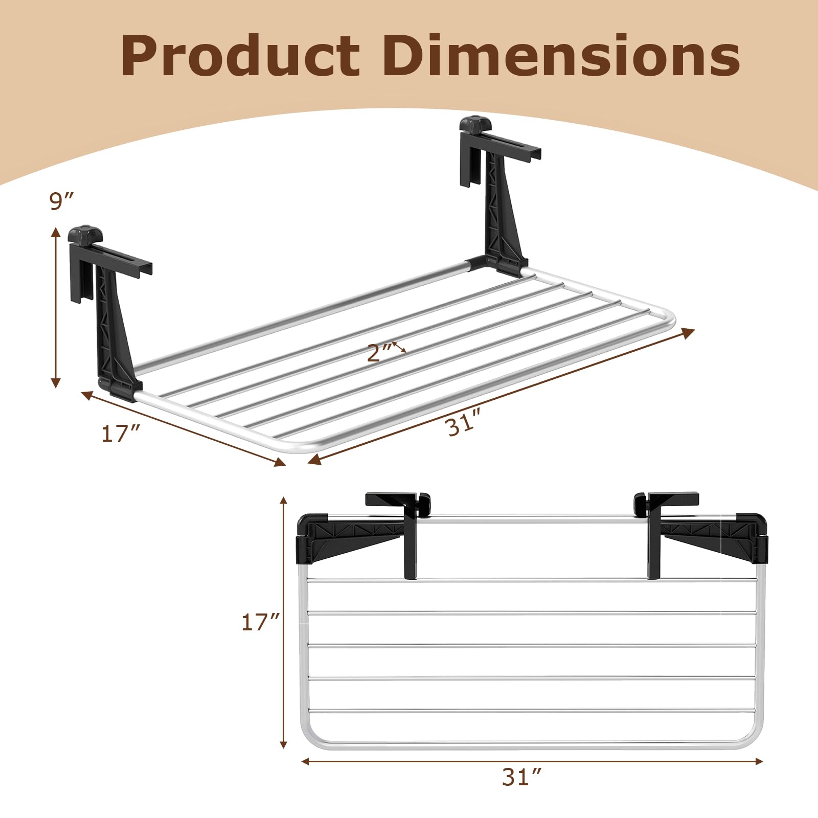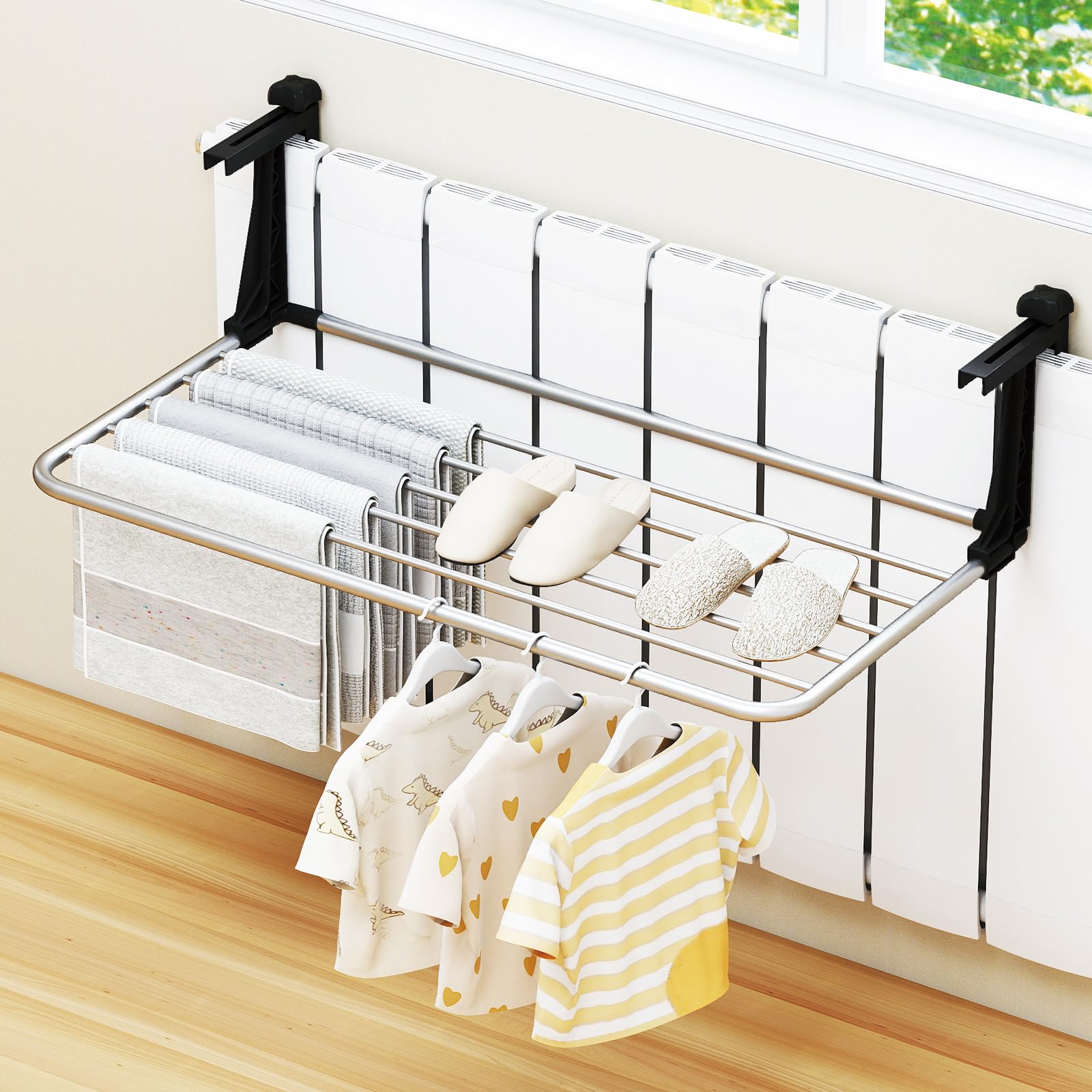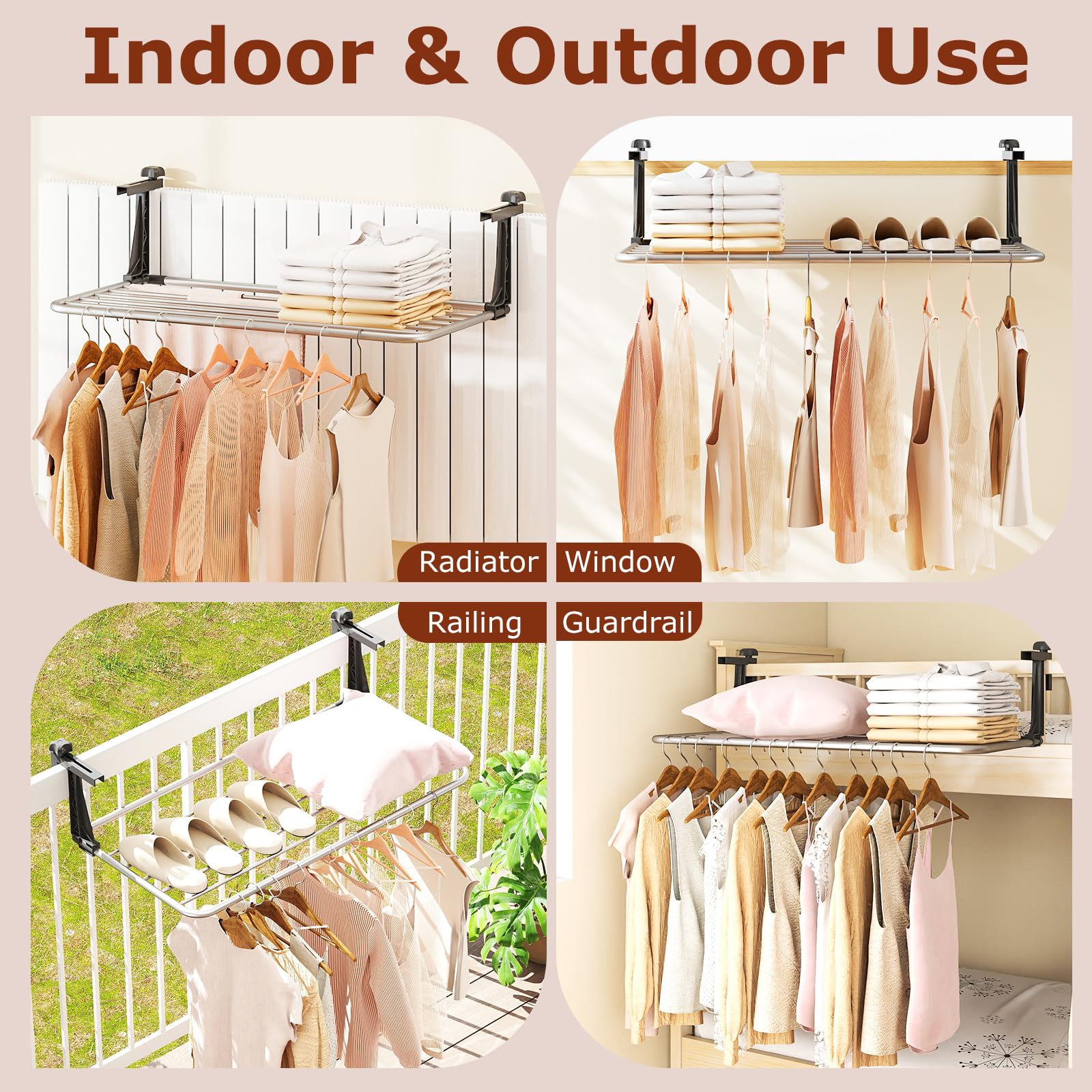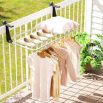 This portable drying rack is equipped with a robust aluminum frame that ensures scratch-resistance, heat-resistance and windproof stability, making it able to withstand the test of time. The retractable design of adjustable hook length allows you to customize the distance to fit hanging edges of different thicknesses, while the spacious and ventilated hanging area promotes faster drying for clothes, towels and shoes. Ideal for both indoor and outdoor use, this versatile rack fits seamlessly on balconies, windowsills, radiators, guardrails and more.