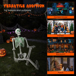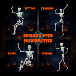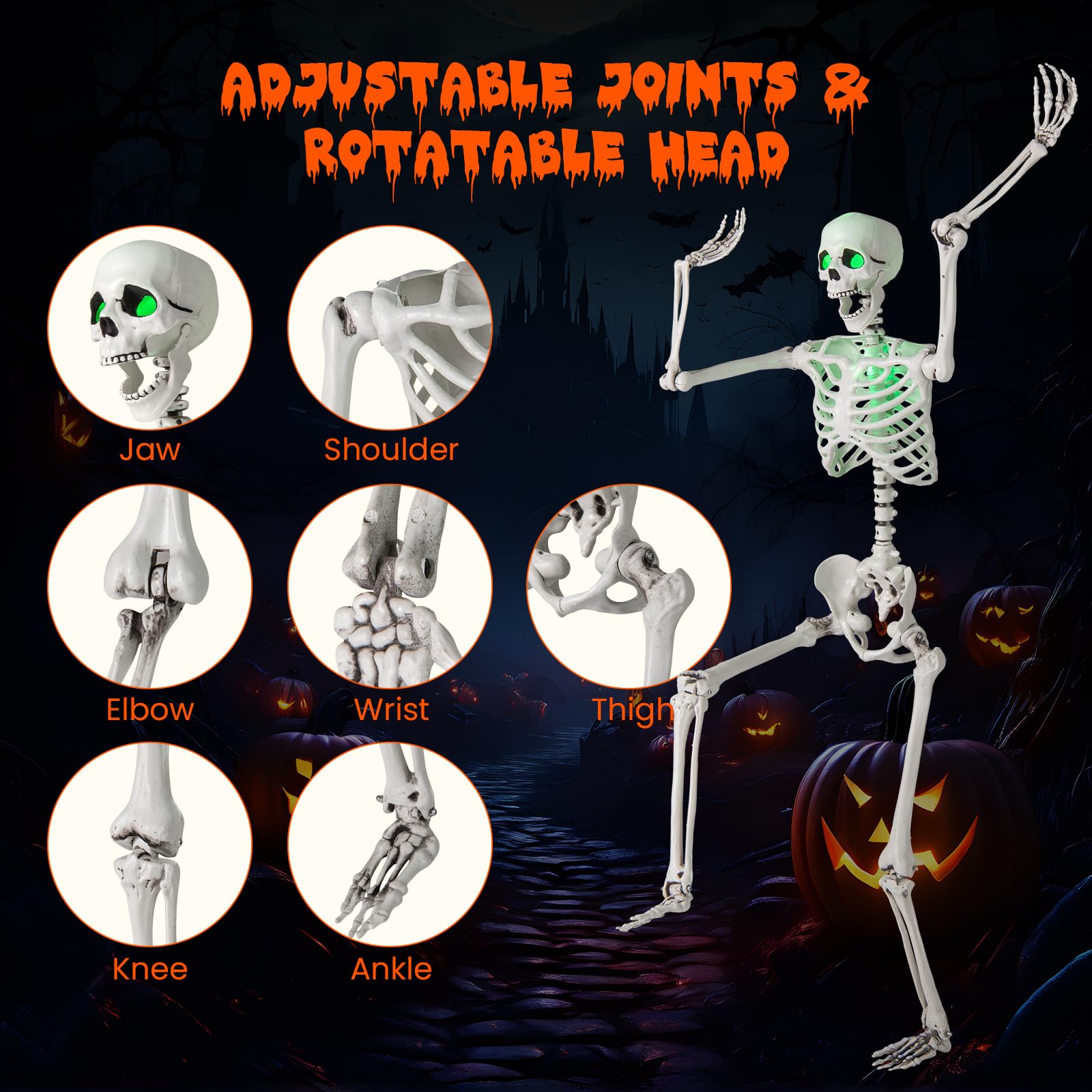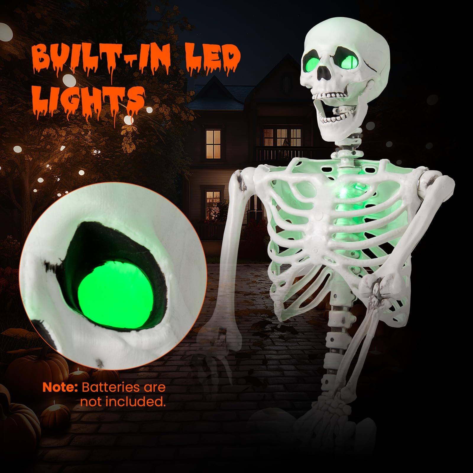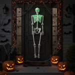 This Halloween skeleton features LED lights that emit an eerie green glow from its eyes and chest, perfect for enhancing the fright in any haunted house or spooky setup. With flexible joints enabling various poses and realistic details, this life-size skeleton offers versatility in creating chilling scenes. This skeleton comes fully assembled with batteries and an integrated hanging rope for easy display. Whether indoors or outdoors, this versatile decoration adds a spine-tingling touch to your haunted house, backyard, porch, or Halloween party.