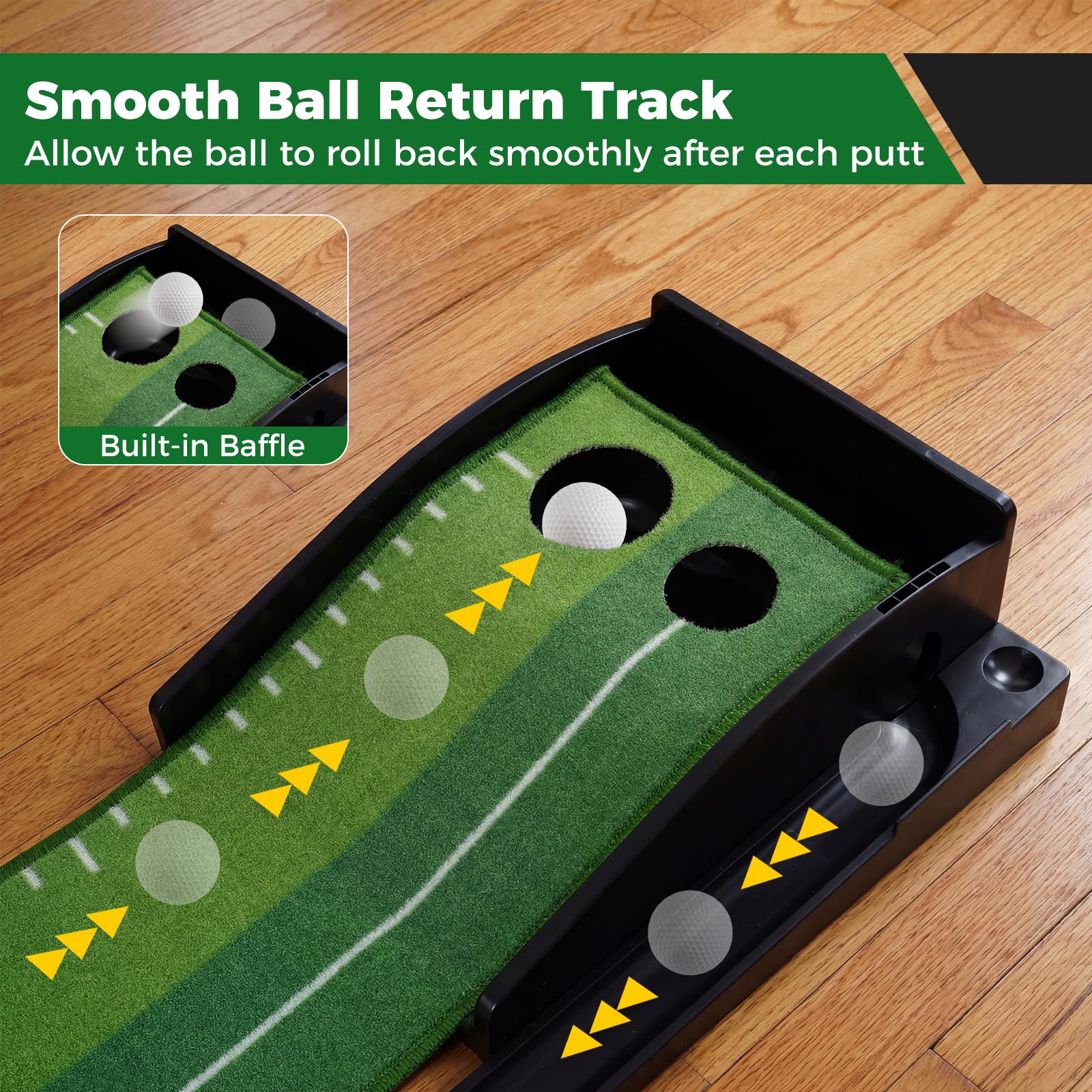 It features a smooth ball return track for continuous practice and clear distance markings at 2, 4, 6, and 8 feet. These allow for targeted improvement at various ranges, promoting better distance control and putting consistency. The 2 different hole sizes help both beginners and advanced golfers refine their accuracy and build confidence. Complete with thoughtful details like a baffle to keep balls in play and 3 included practice balls, this lightweight golf putting mat is portable and easy to store. In addition, it's perfect for use in indoor golf corners, offices, or outdoor spaces.