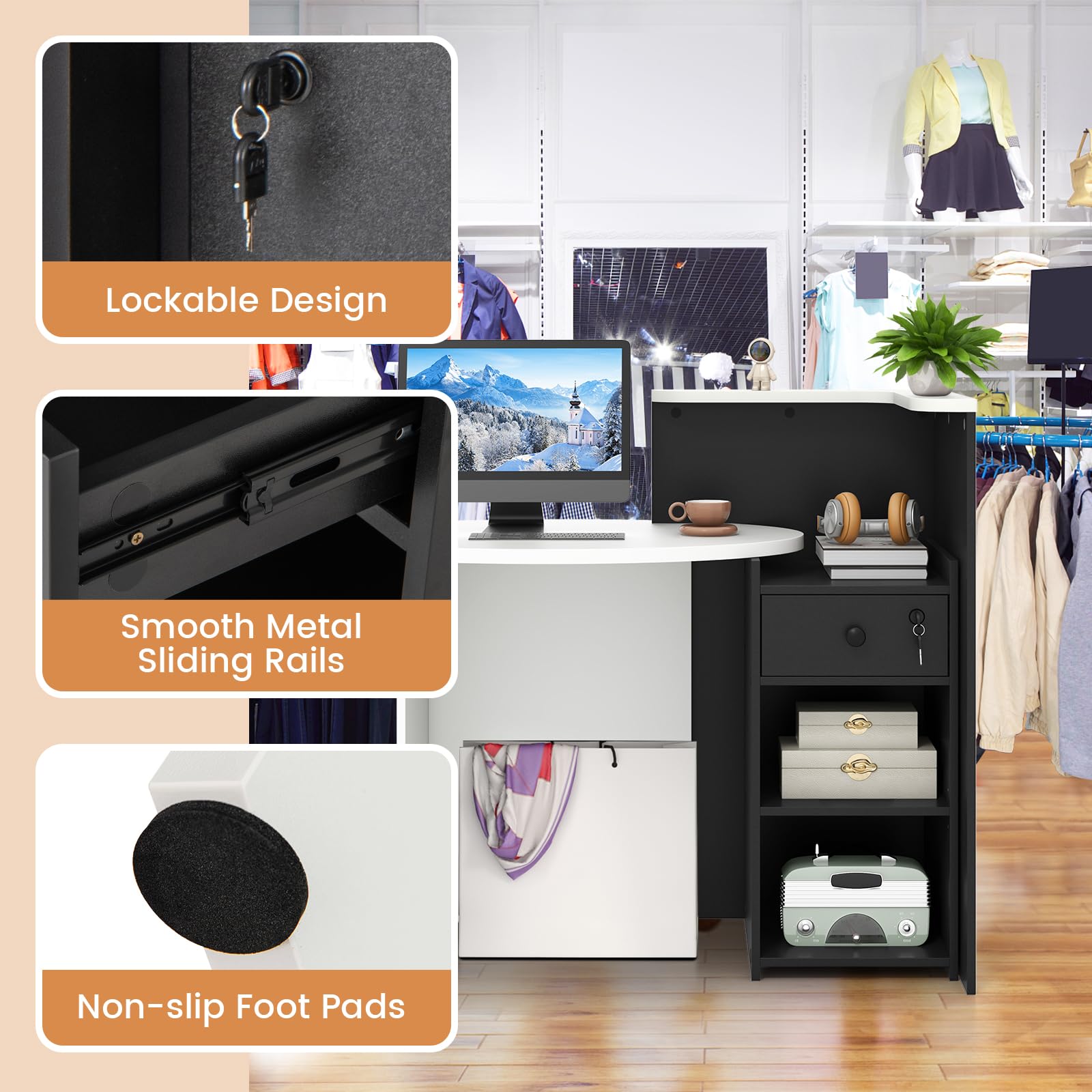 - Clutter-free Storage Solution: The wide oval desktop facilitates the placement of cash register, computer, brush pot or plants. In addition, any office stuff placed on the L-shaped top shelf and 2-tier open shelf can be accessible easily. 3-position adjustable shelf is convenient to store different sized items, such as books and shopping bags.