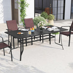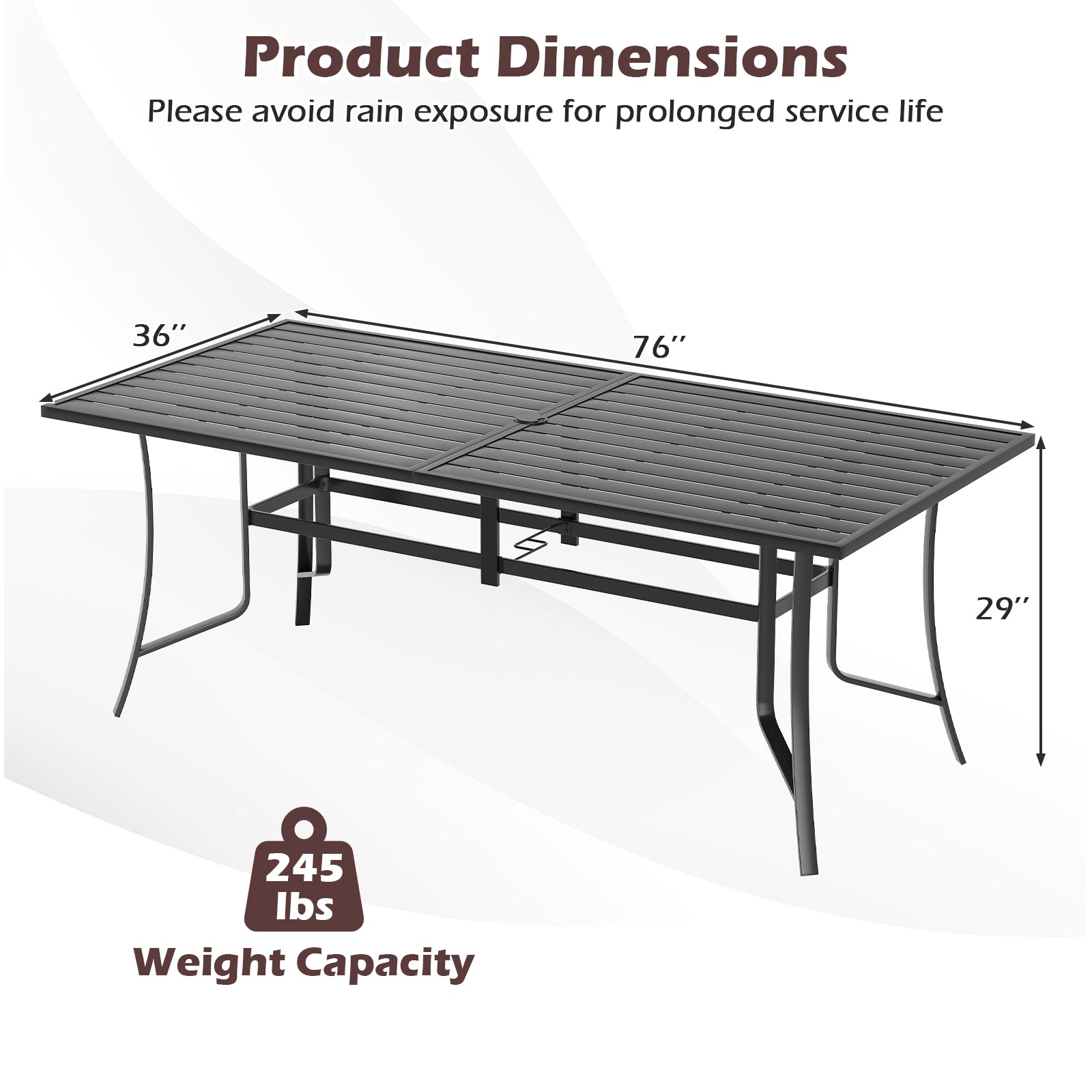 This patio dining table features a sturdy metal construction with reinforced crossbars, ensuring excellent stability and durability for years of use. The 76” x 36” rectangle tabletop provides ample space to comfortably seat 8 people, making it perfect for gatherings and meals. Designed with curved legs and tubes, the outdoor table adds a sleek, contemporary touch while maintaining strong structural support. Additionally, the built-in umbrella hole accommodates most standard umbrellas with diameters of 1.57”, 1.97” or 2.36”, and includes a removable lid for when shade is not needed.