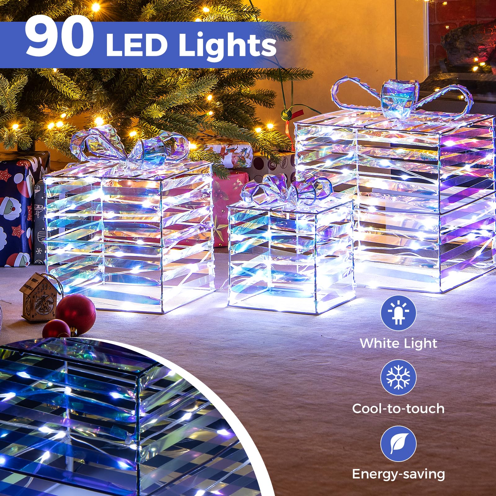 - Dazzling Display of Lights: These Christmas lighted gift boxes are pre-lit with 90 white LED lights, which create a inviting glow. Additionally, these energy-saving LED lights remain cool to the touch, making them safe around children and pets.