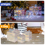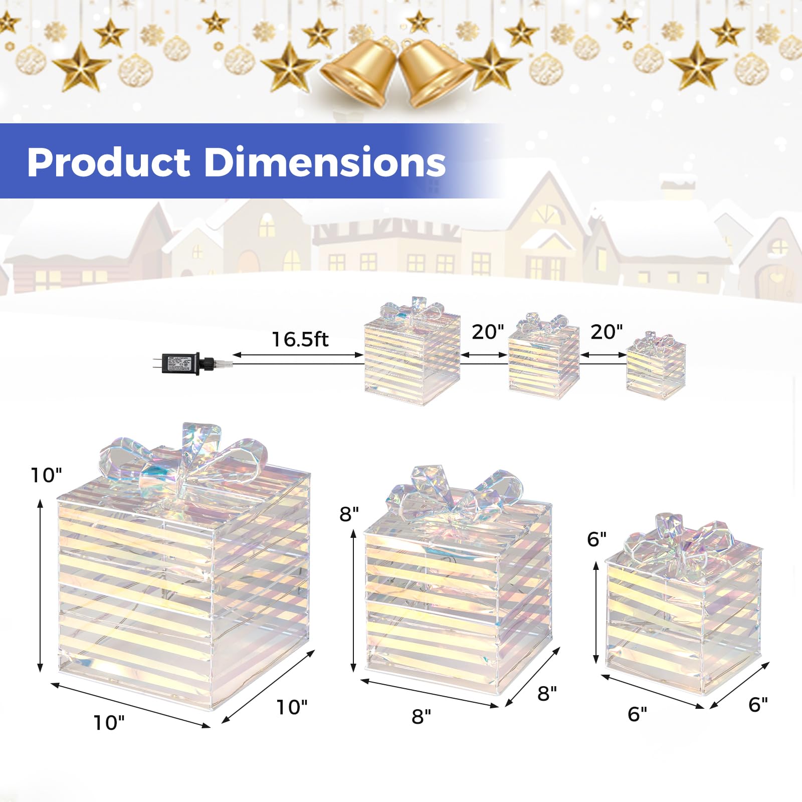 - Convenient Plug-in Operation: These lighted gift boxes feature a convenient plug-in operation, ensuring continuous lighting. The included two 20” connector cords and one 16.5 ft power cord allow for effortless arrangement of the boxes at varying distances.