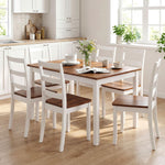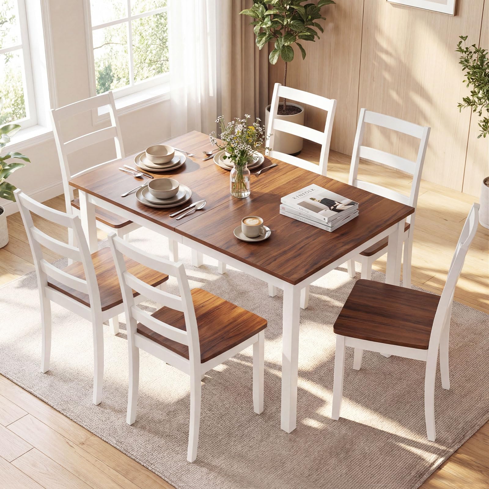 Enhance the charm and functionality of your dining space with our 7-Piece Dining Set of 6. Crafted with quality in mind, this set includes a solid wood rectangular table and 6 chairs, making it perfect for gatherings and family meals. With its farmhouse-style design and sturdy rubber wood legs, this dinette set adds a touch of rustic elegance to any kitchen, dining room, or restaurant decor.