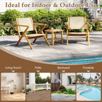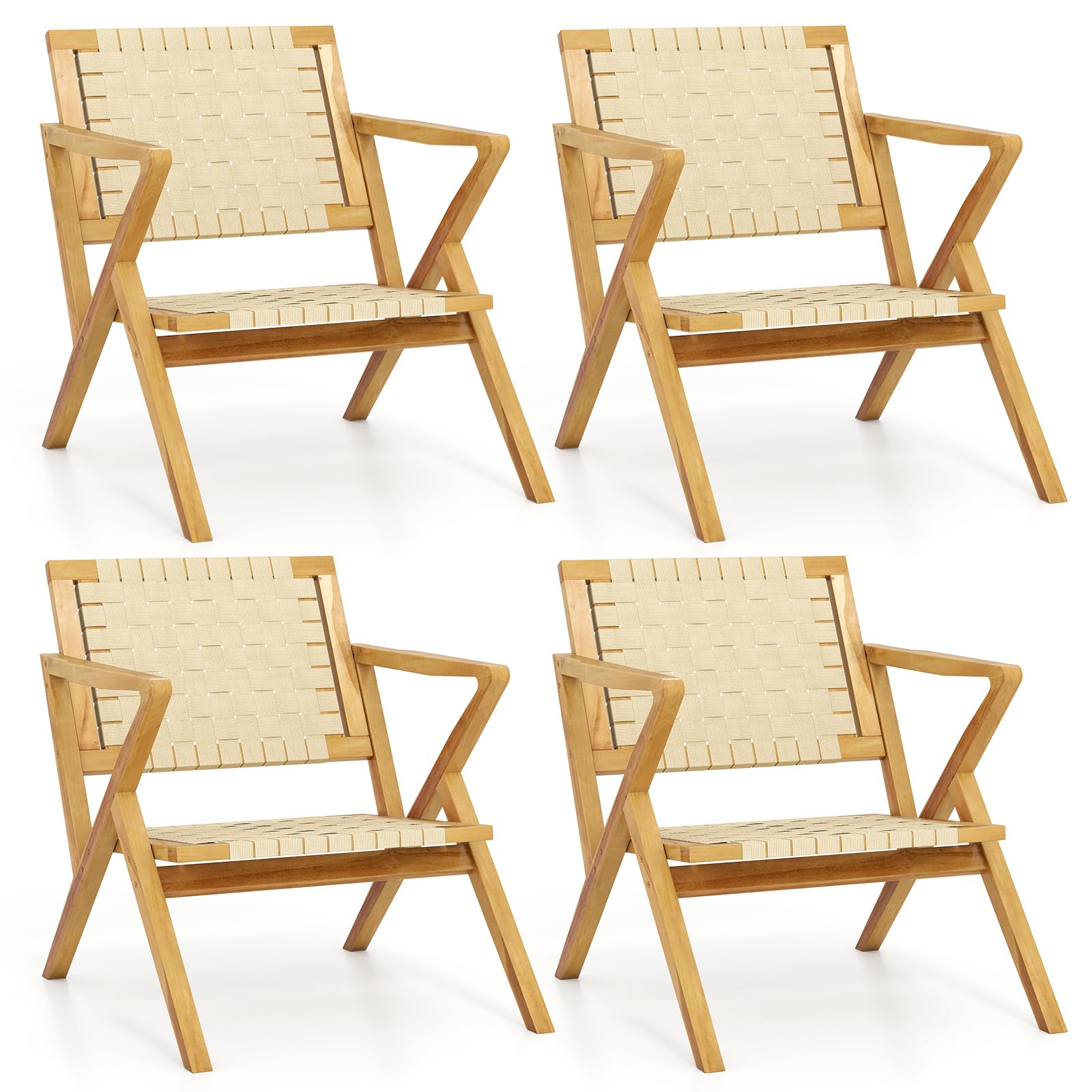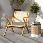 This patio chair is constructed from sturdy and anti-crack teak wood with water-based painting for prolonged service life. This wooden armchair features a webbing seat and a slanted backrest, providing a breathable and comfortable sitting experience. The armrests are carefully crafted to support your arms naturally. Additionally, the natural color of the wood complements any indoor and outdoor space, adding a rustic charm to your living room, balcony, backyard, porch, etc.