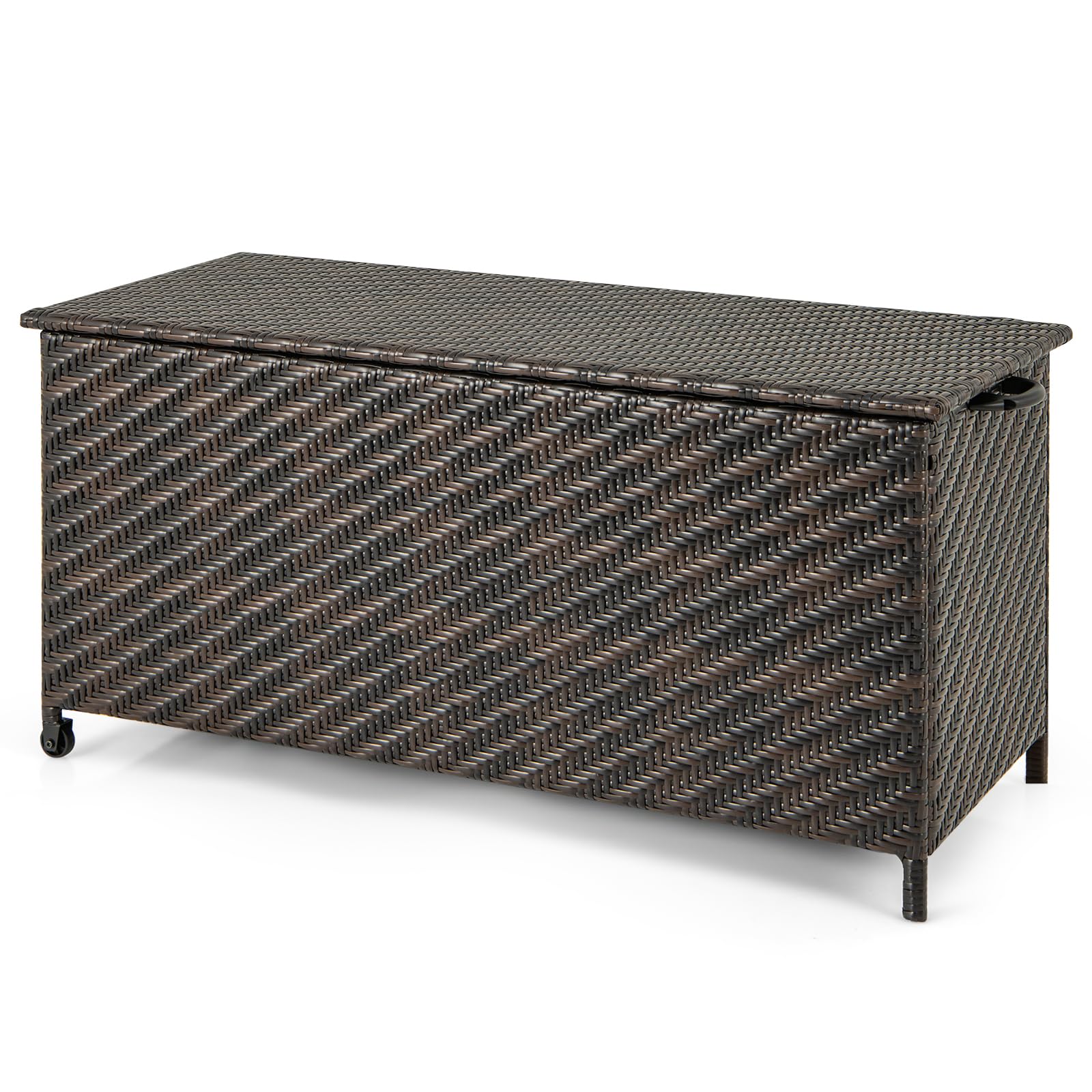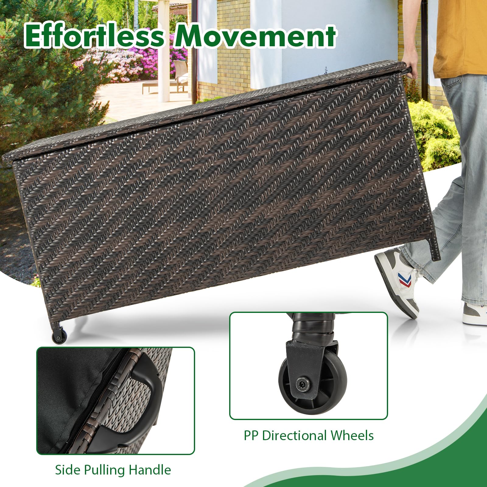 - Hassle-Free Movement: Featuring a convenient side pulling handle and 2 universal wheels, the 54”L x 22”W x 25”H rattan deck box is designed for effortless movement around your patio, garden, or any indoor space.