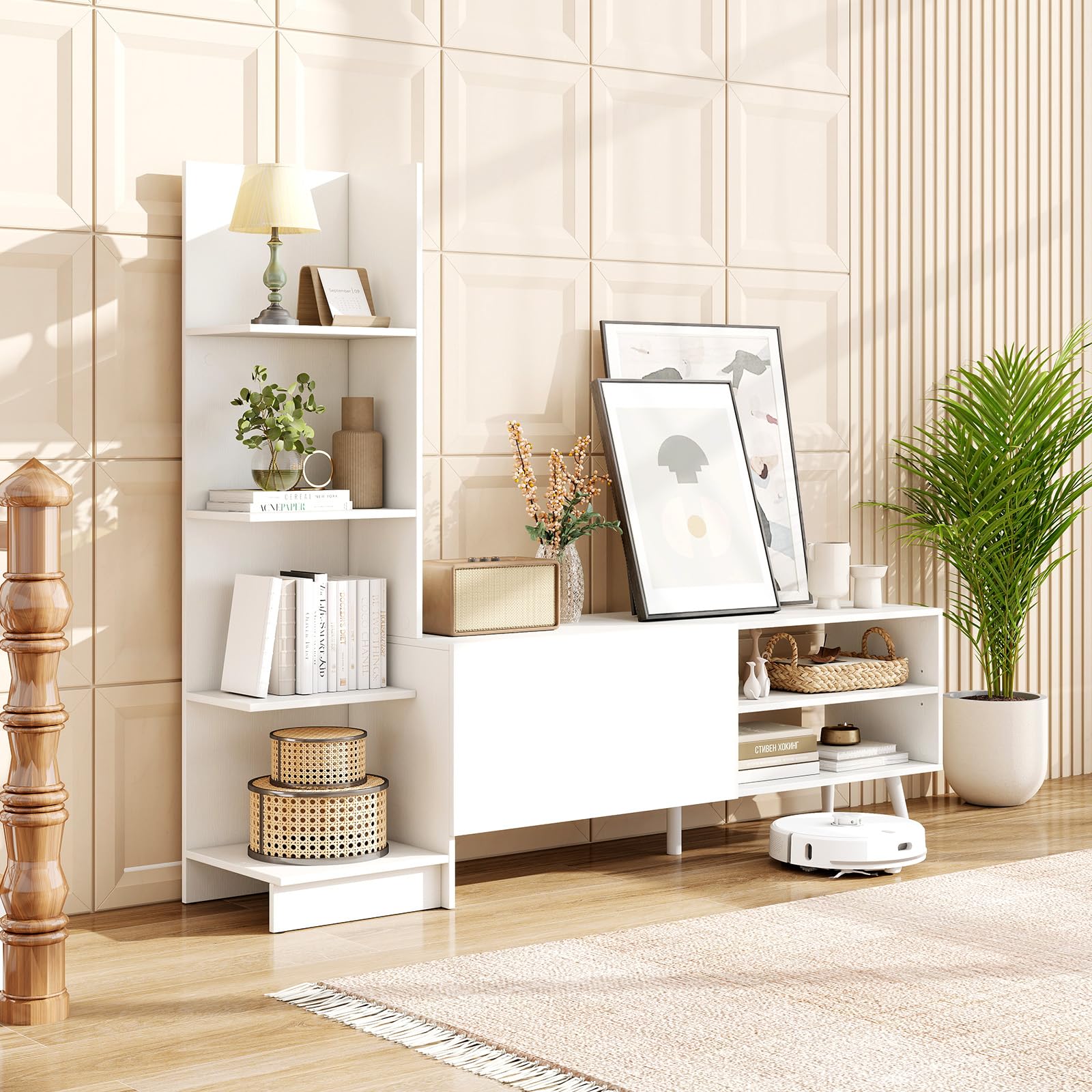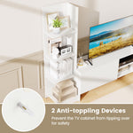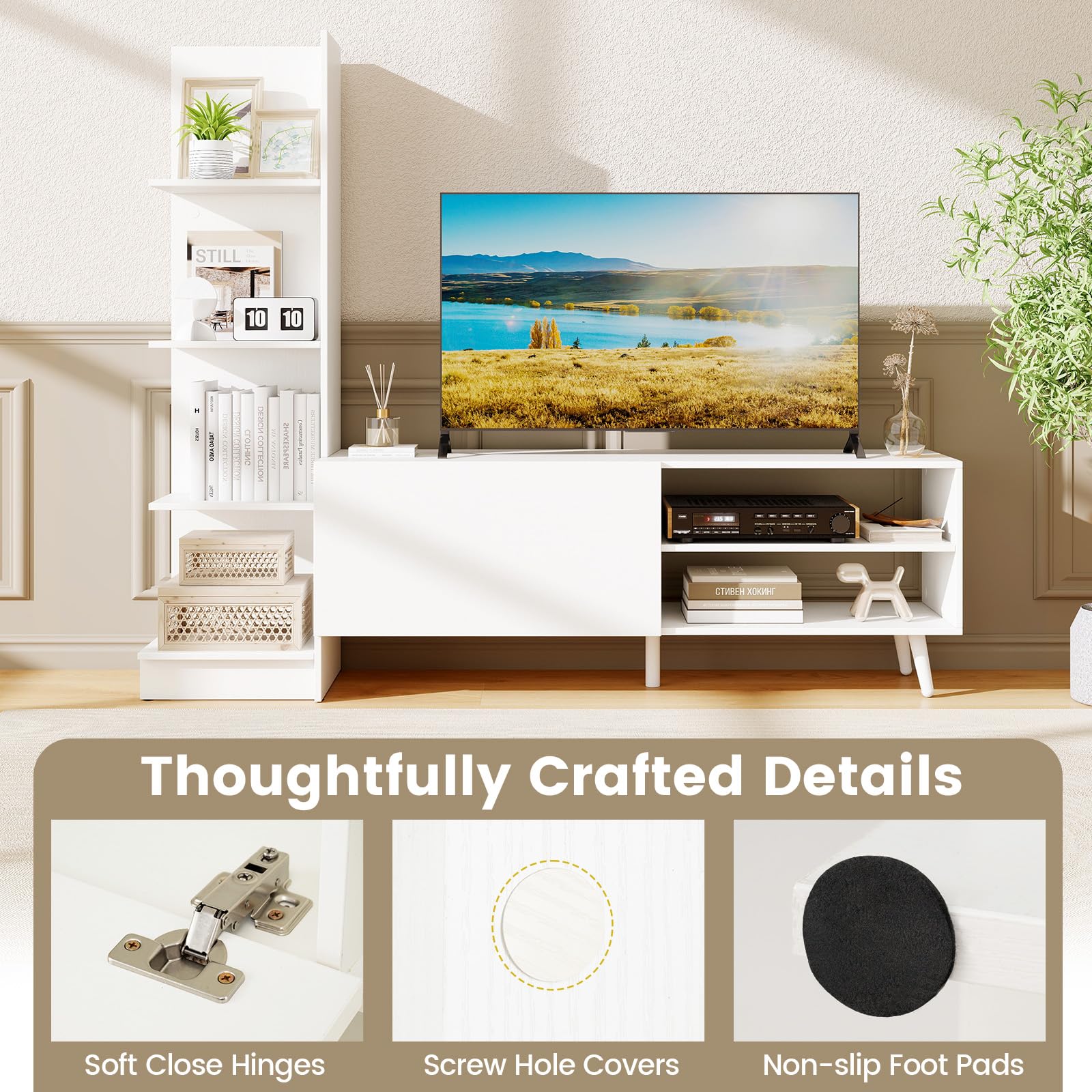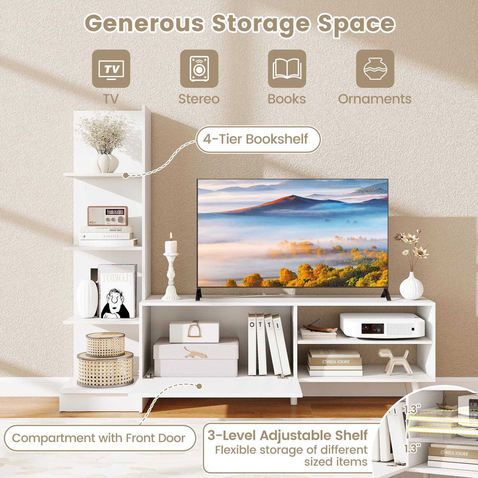 Transform your living space with this versatile and stylish TV stand featuring generous storage space for all your media devices. This modern and minimalist design doubles as a 4-tier bookshelf, saving floor space while enhancing your room's appeal. With a safe and robust construction, this TV cabinet provides reliable support and can accommodate a TV up to 50 inches. Thoughtfully crafted details such as screw hole covers and easy-to-clean surfaces ensure a clean and stylish appearance. Perfect for your living room, bedroom, or study, this multipurpose cabinet is the ultimate storage solution for your home. Don't miss out on this chic and practical addition to your home!