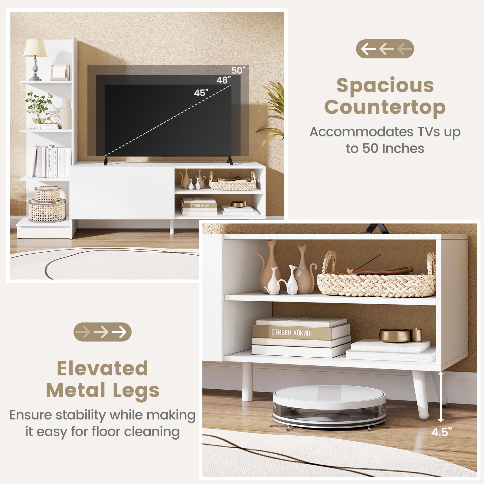Spacious countertop accommodates TVs up to 50 inches