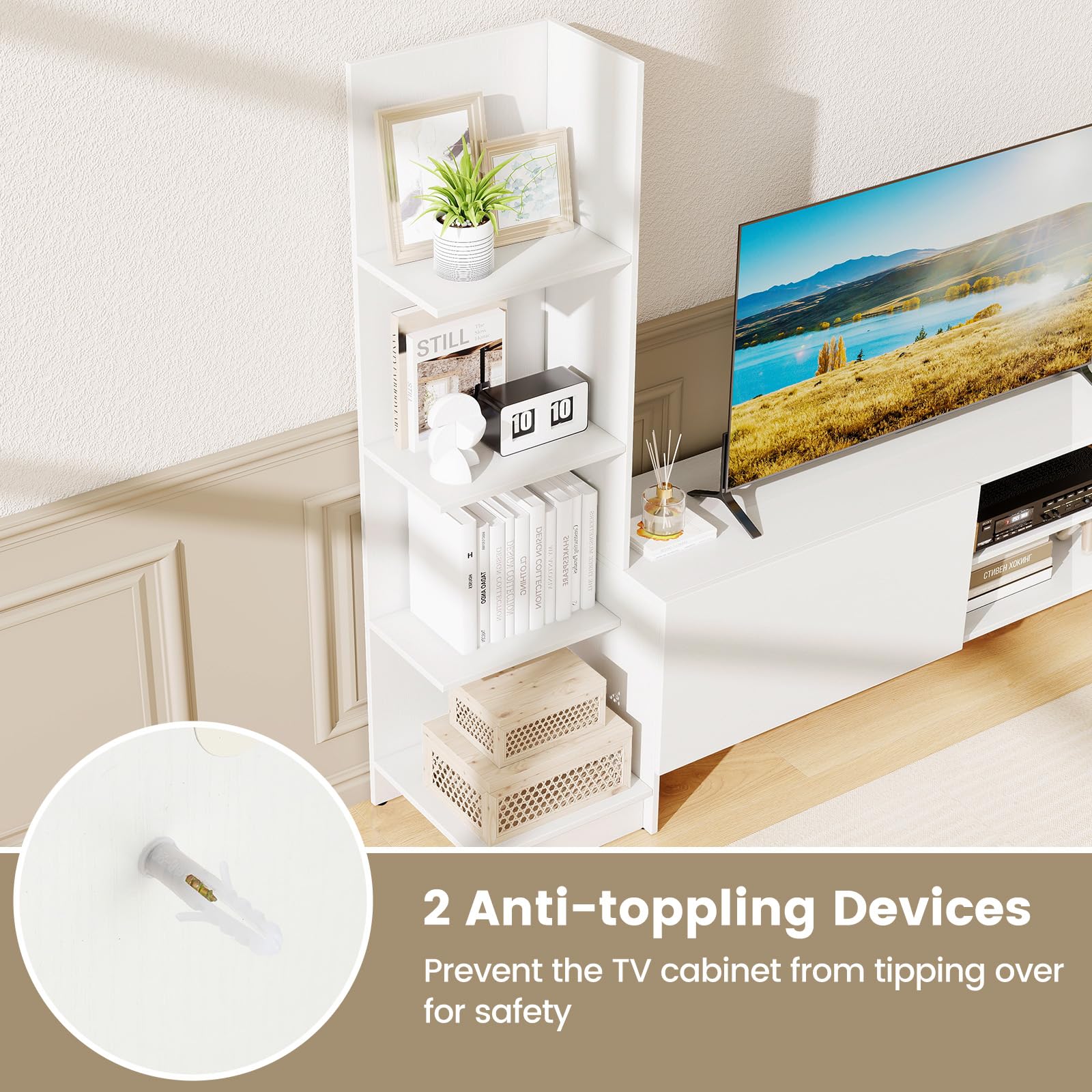 2 anti-toppling devices prevent the TV cabinet from tipping over for safety