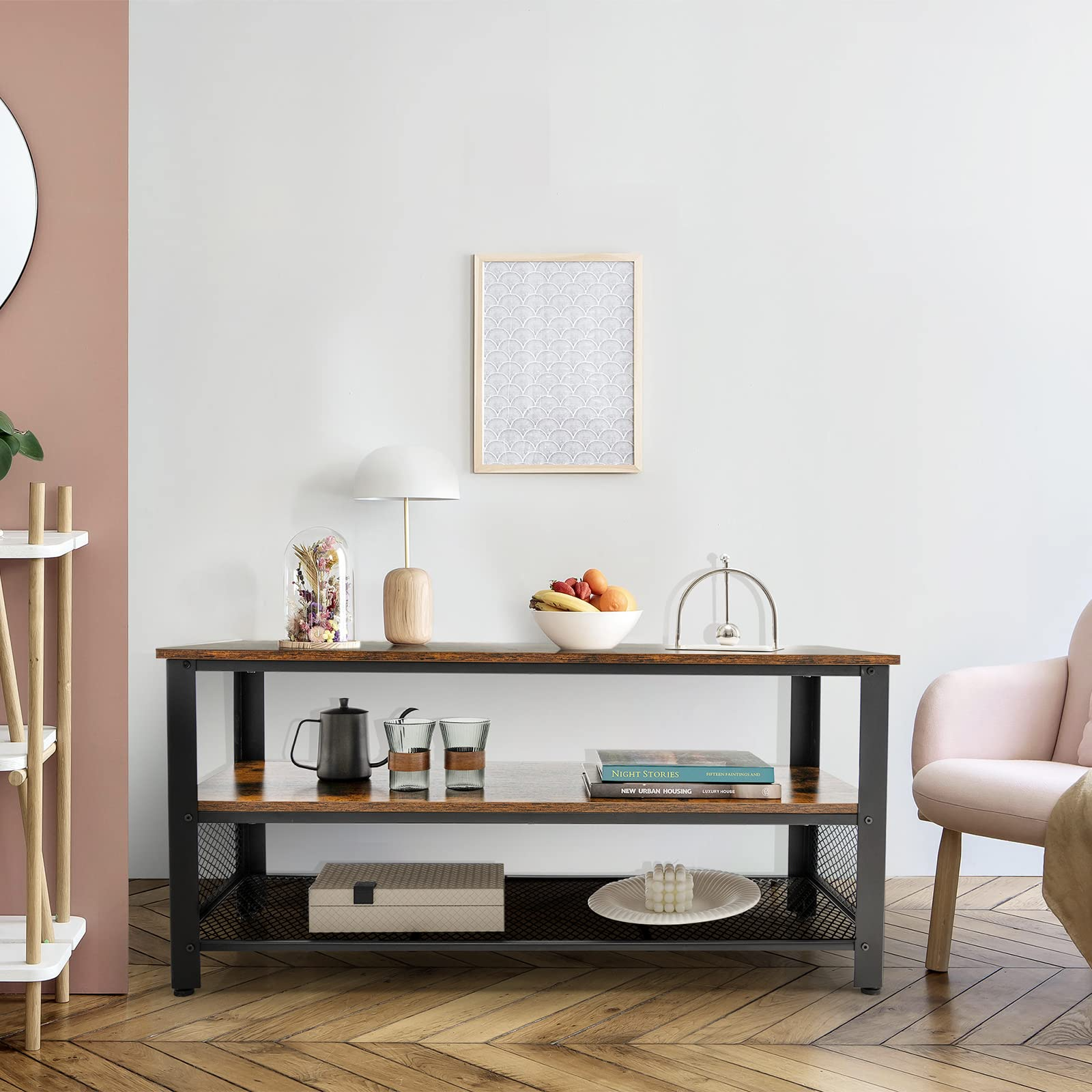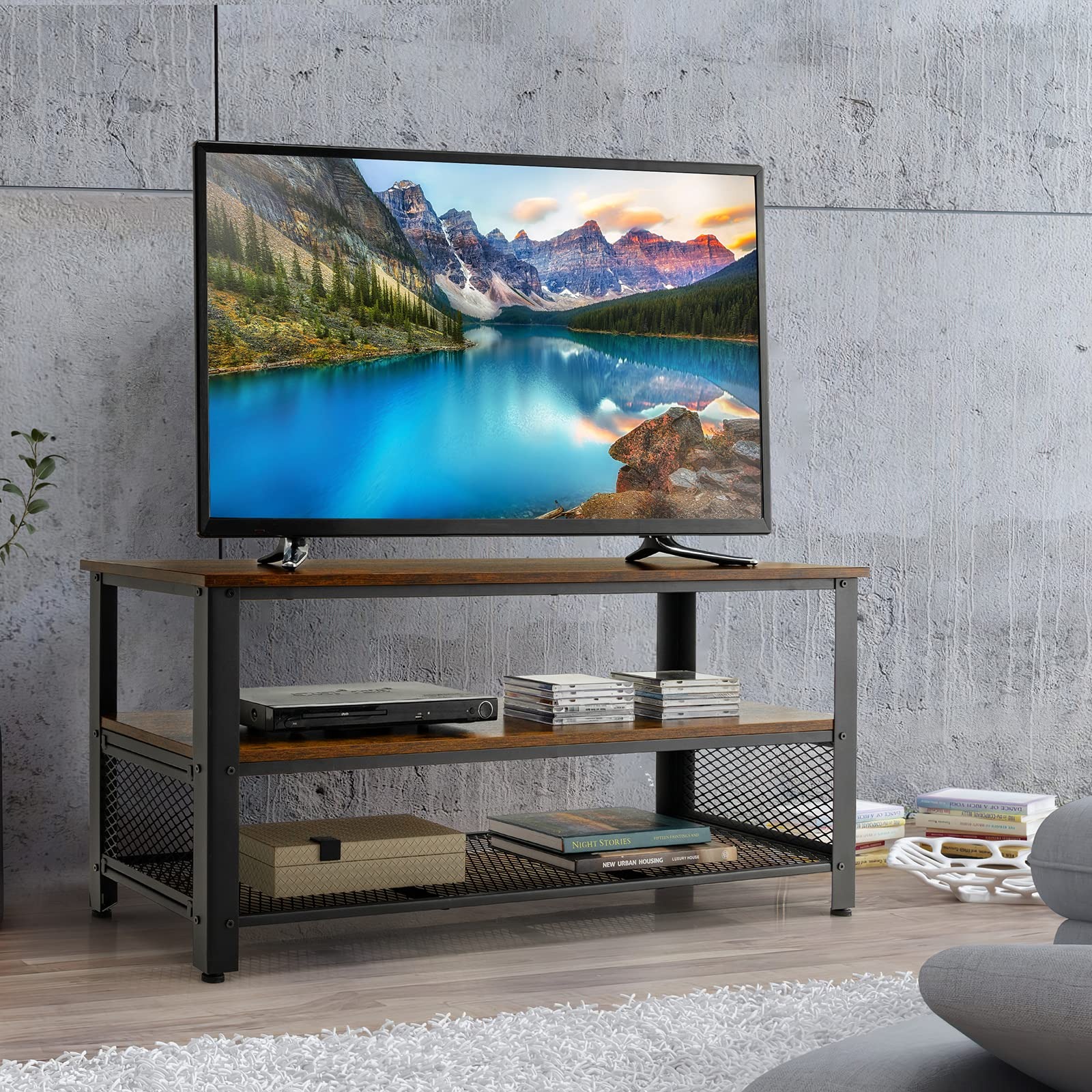 The combination of rustic brown board and black steel pipes gives off a charming industrial flavor, making the TV stand integrate seamlessly into different home decorations. The wide tabletop is spacious enough to support a TV up to 50 inches, while the 2 lower shelves offer roomy storage and display space for various items. You can use it as a console table or TV stand to display and store your favorite collections, family portrait, book, DVD player, remote controllers, ornaments, storage boxes, and gaming devices. The metal mesh fences will protect your items from falling off. The adjustable foot pads take overall stability to the next level. What's more, the rustproof and sturdy steel frame endows the console table with large weight capacity and remarkable durability, so you can use it with confidence.