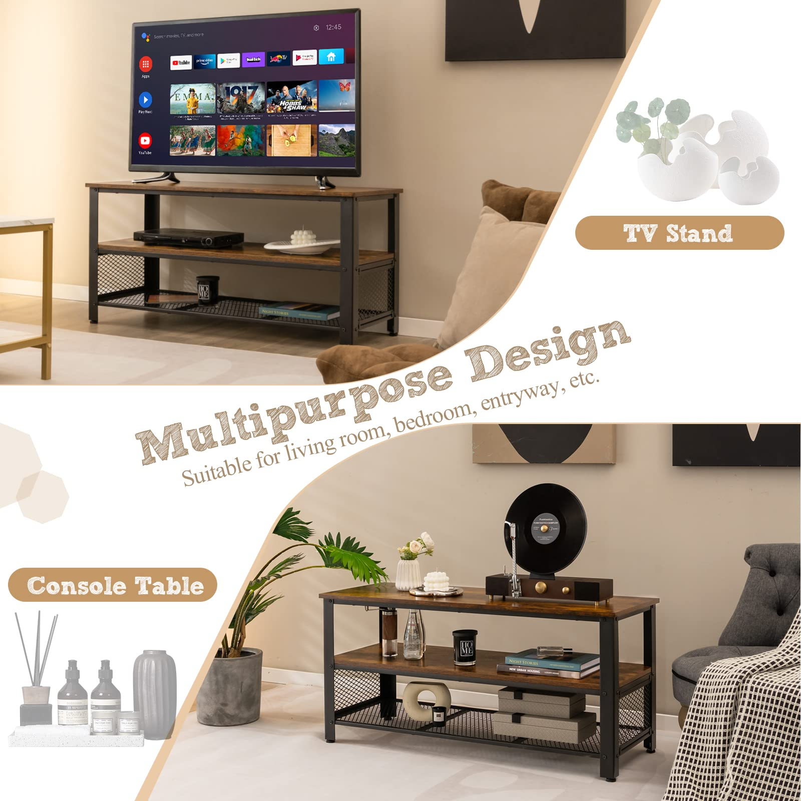 - Multipurpose Design: The TV stand is able to accommodate most flat-screen TVs up to 50" for a great visual feast in the living room. Also, it can be used as a console table, an entertainment center, and even a sofa table, or hallway table. The industrial and stylish appearance fits well with any other decoration style.