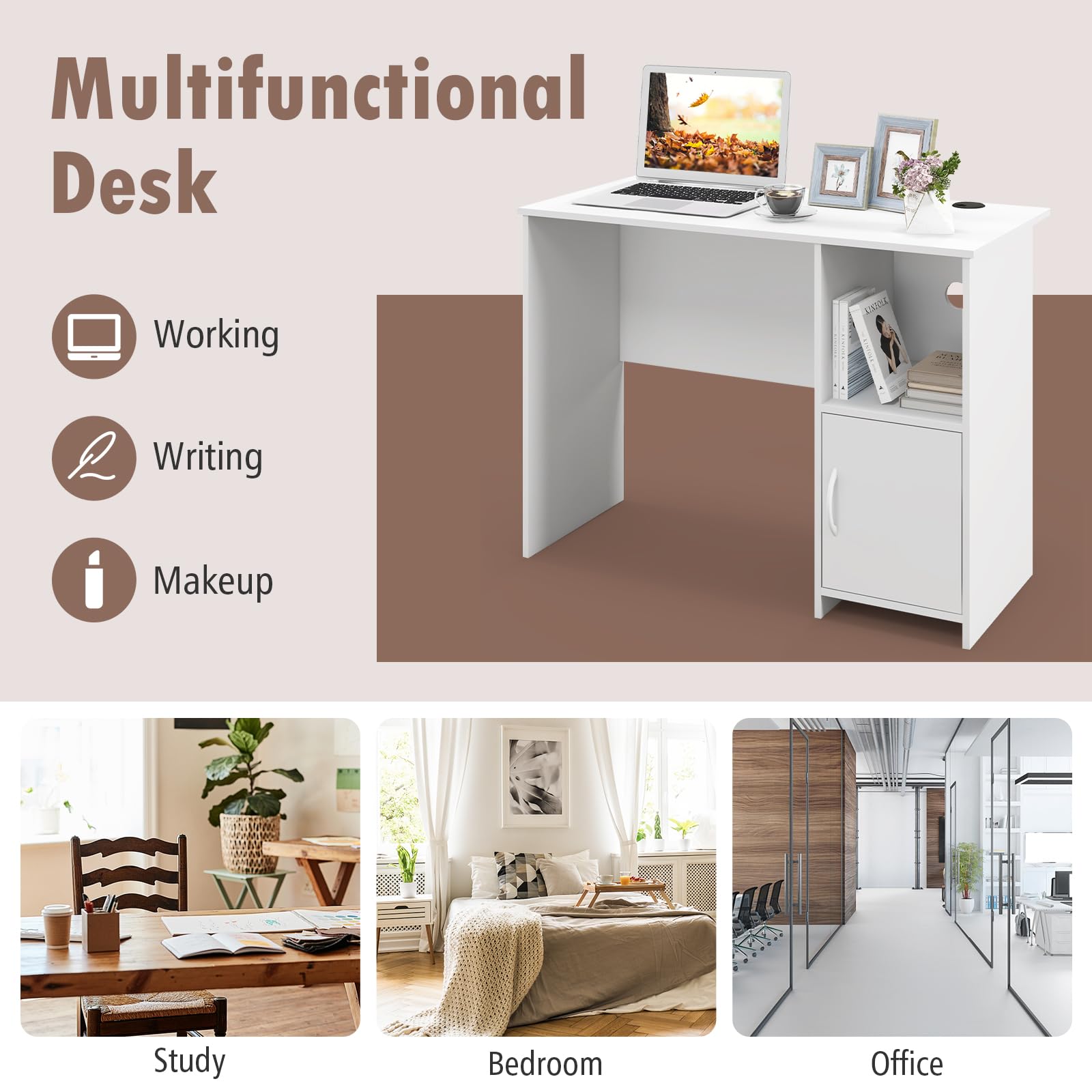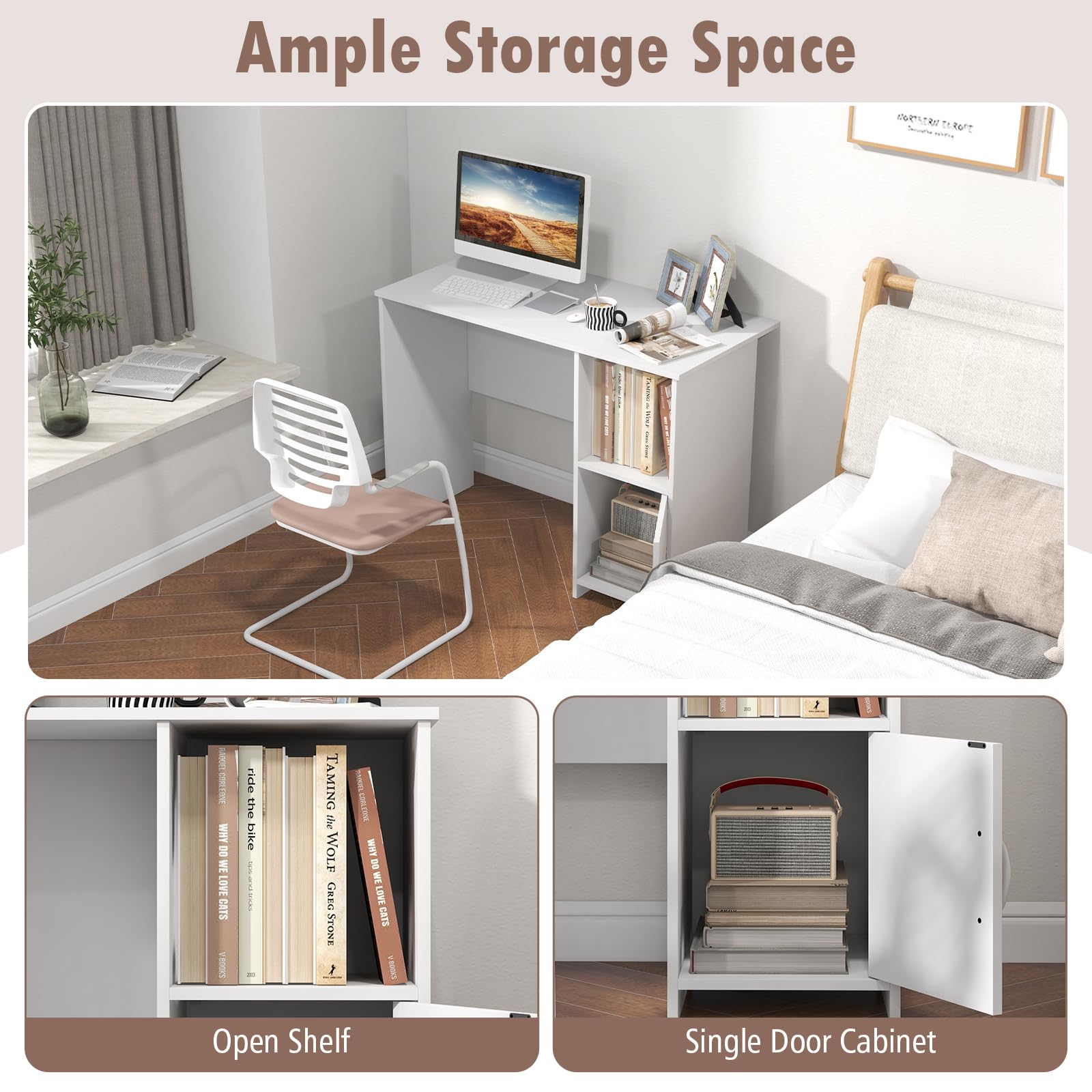 - Open & Enclosed Storage Space: Except for the wide tabletop, the study desk features an open shelf and a single door cabinet that keep books, files and other sundries in order. Thus, you will no longer be bothered about messy room.